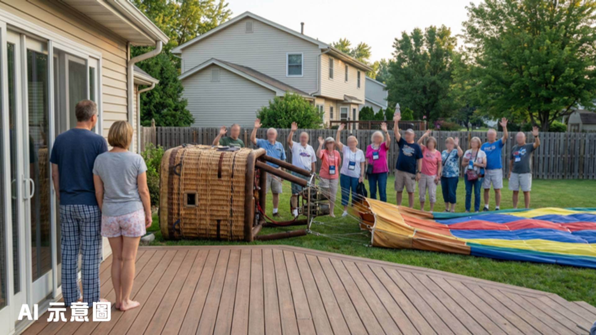 事發喺4月18日朝早大約8點半,美國加州一對夫婦亨特同珍娜(Hunter and Jenna Perrin)當時一個睇緊電視,一個做緊瑜伽,非常寫意。點知突然有人瘋狂敲門,通知佢哋:「有個熱氣球降落咗喺你哋後花園啊!」夫婦二人半信半疑走去睇,眼前景象令佢哋當場O嘴!一個巨大嘅熱氣球不偏不倚就降落喺後花園草地,吊籃入面仲企滿超過10個遊客,呢班遊客完全唔驚,仲好興奮咁向屋主揮手兼舉V,場面既詭異又搞笑。