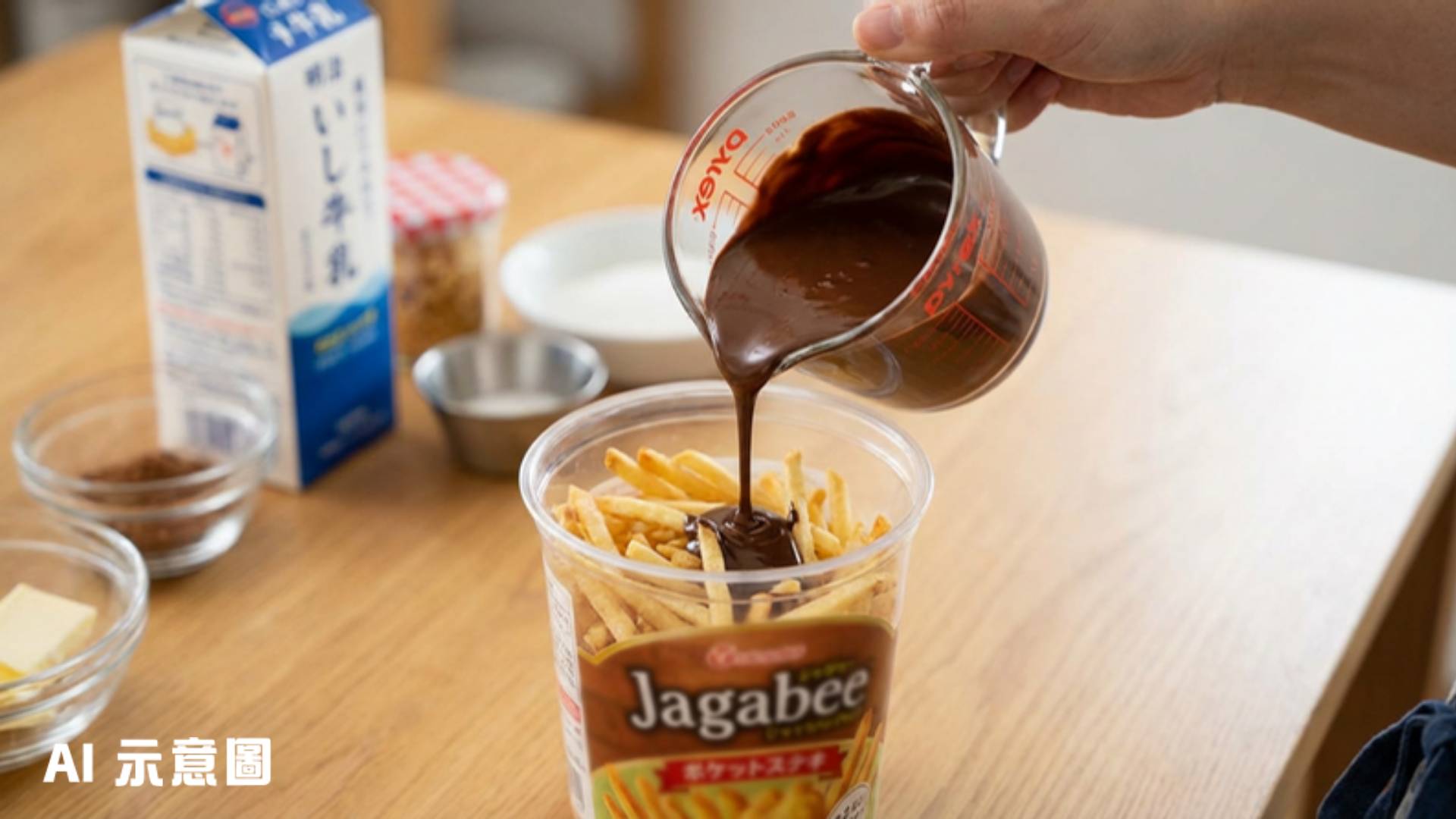 呢位日本記者P.K. Sanjun本身都係想跟風試整「品客朱古力」,但去到便利店時,佢嘅目光就被貨架上嘅Calbee「Jagarico」薯條吸引住。佢心諗:「既然都係筒裝,點解唔試下用呢款日本國民零食?」於是佢即刻買咗一筒Jagarico同埋一排Lotte Ghana牛奶朱古力。做法同原版一樣簡單到爆,首先將朱古力隔熱水座溶,然後打開Jagarico,將熱辣辣嘅朱古力漿慢慢倒入去,期間輕輕敲打杯身,確保朱古力漿填滿所有空隙。最後用保鮮紙包好,放入雪櫃冷藏足足4個鐘就大功告成!