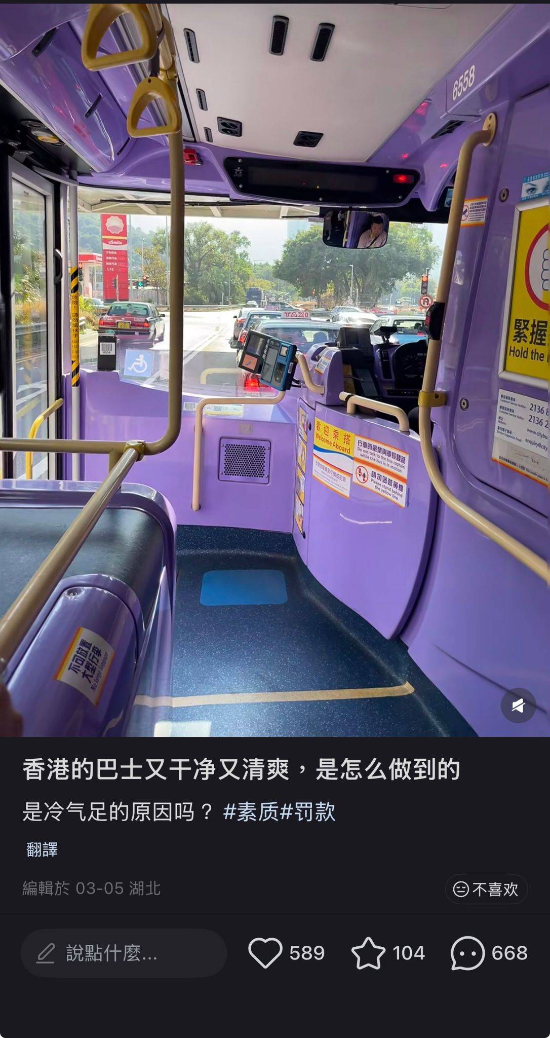 發帖的內地網民上載了一張乘坐香港城巴的車廂照片,驚嘆地發問:「香港的巴士又乾淨又清爽,是怎麼做到的?」這條問題瞬間引起大批曾遊港的內地客共鳴,紛紛湧入留言區盤點香港巴士的兩大完勝優點。第一是「不暈車」,有網民直言:「香港的車我不暈,大陸的車我暈死」;第二則是「座位舒適」,有人大讚座椅軟熟,笑指自己習慣了內地公交車的「鐵腚(鐵造的硬座位)」,來到香港坐巴士竟然感受到「帝王般的待遇」。