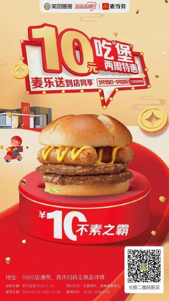 內地麥當勞於周三(1月24日)開始了為期三天的「不素之霸」優惠,雙層牛堡只售10元人民幣(折合約港幣10.9元)。活動引起了極大的迴響,導致餐廳爆滿,網上訂餐系統也一度崩潰。開賣當日各分店的麥當勞餐廳迅速湧入了大量食客,全場爆滿,工作人員忙碌不堪,依然無法滿足所有顧客的需求。有不少食客於網上點餐,但就發現系統一度崩潰無法正常運作。到了下午約5點,「麥當勞崩了」的話題已經成為多個社交平台的熱門搜索。根據麥當勞的微信小程序顯示,截至昨天傍晚6點左右,成都的所有門店要麼顯示售罄,要麼在將食品加入購物車後無法跳轉到付款頁面,卡券也無法使用。