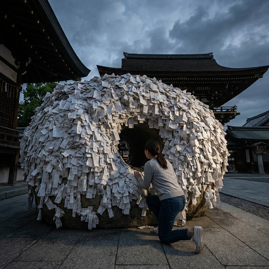 個案的核心,是一塊高約1.5米、寬約3米的巨石,名為「緣切緣結碑」。石碑中央有一個圓洞,僅容一人匍匐穿過。據目擊證人憶述,整塊石碑被成千上萬張白色紙片「形代」(かたしろ)所覆蓋,紙上寫滿了參拜者的願望,景象極為震撼。這些紙片承載著無數人的痛苦、怨恨與期盼,使石碑本身散發出一種難以言喻的沉重氣場。