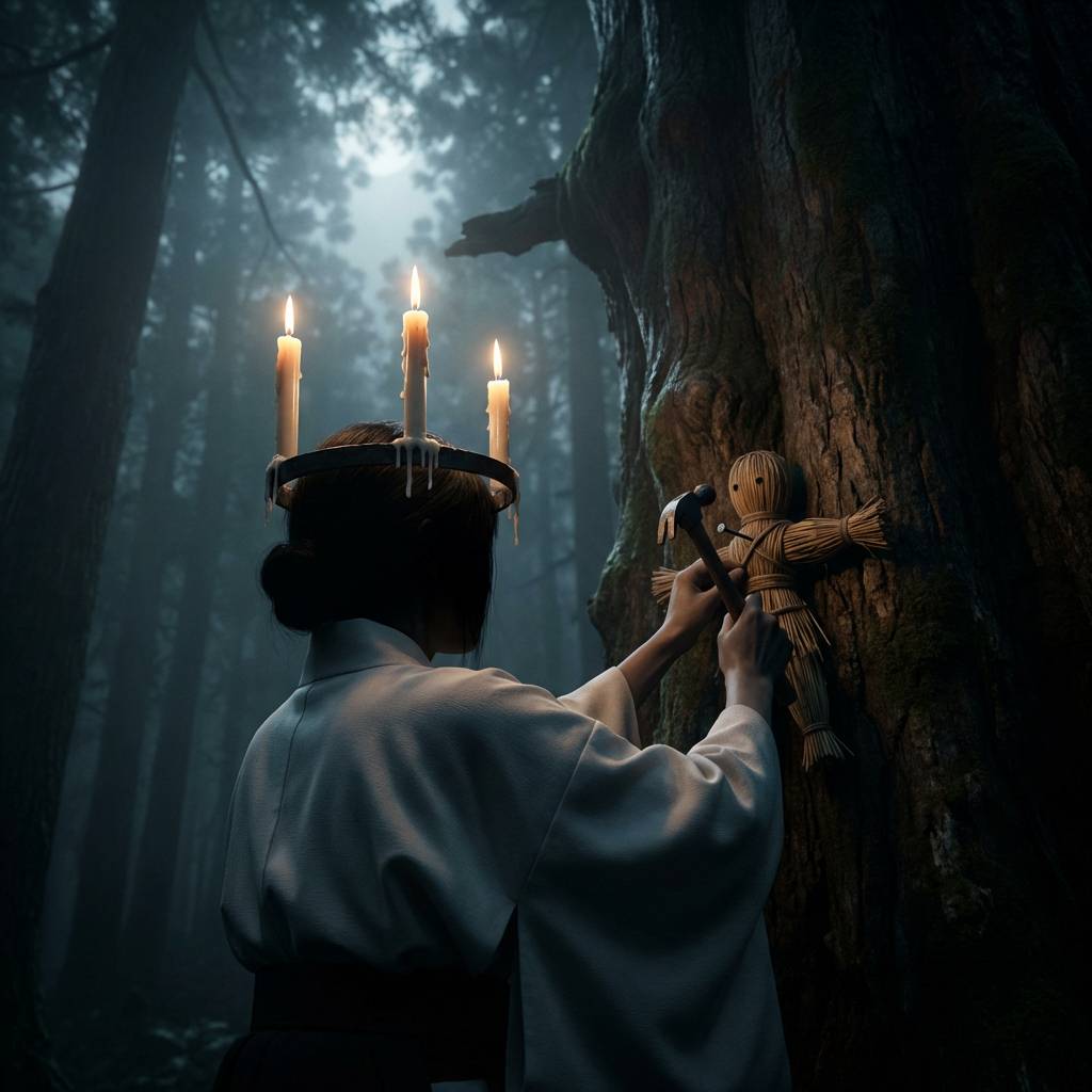 本檔案最核心的部分,涉及一項被嚴格封鎖的傳說——「丑時參拜」(Ushi no Koku Mairi)。據解密文件與民間傳說記載,貴船神社的奧宮,是這項古老詛咒儀式的施行地。傳說在丑時三刻(約凌晨一點至三點),當萬物俱寂、陰氣最盛之時,心懷怨恨之人會身穿白衣,頭戴綁著三根蠟燭的鐵環,腳踏單齒木屐,來到奧宮的御神木前。