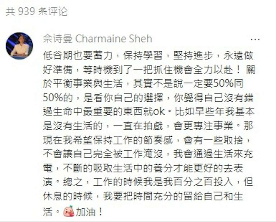 佘詩曼在回信中毫不吝嗇地分享人生感悟,她鼓勵粉絲「低谷期也要蓄力,保持學習,堅持進步,永遠做好準備,等時機到了一把抓住機會全力以赴!」關於平衡事業與生活,佘詩曼坦言並非一定要各佔50%,而是看個人選擇,只要覺得沒有錯過生命中最重要的東西就可以。她透露早些年基本沒有生活,一直在拍戲會更專注事業,但現在希望保持工作節奏感,會有取捨不讓自己完全被工作淹沒。佘詩曼更表示會通過生活來充電,不斷吸取生活中的養分才能更好地表演,工作時百分百投入,休息時則把時間充分留給自己和生活。