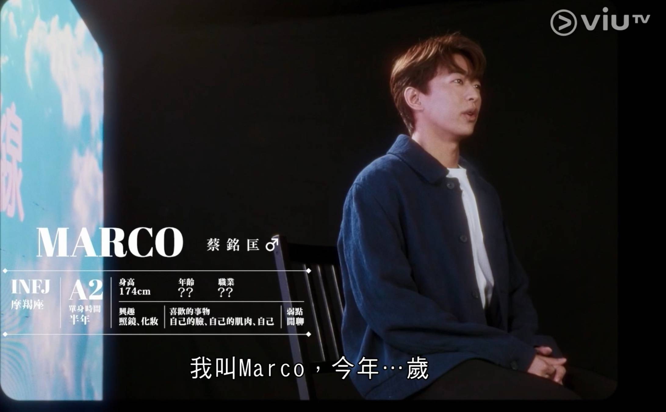 摩羯座INFJ性格的Marco被形容為「團體社交裡的啞巴,單獨相處時的情聖」,但首集表現完全顛覆觀眾期望。作為最早到埗的參加者,Marco對同樣早到的Tracy明顯有好感,但搭巴士時竟然選擇坐在男參加者Wade旁邊,完全不敢與Tracy同坐。這個舉動令Tracy當場表示不滿,公開話「嬲豬」,場面相當尷尬。網民紛紛留言「Marco你咁樣點追女仔呀」、「明明有好感但又唔敢表現,真係急死人」。