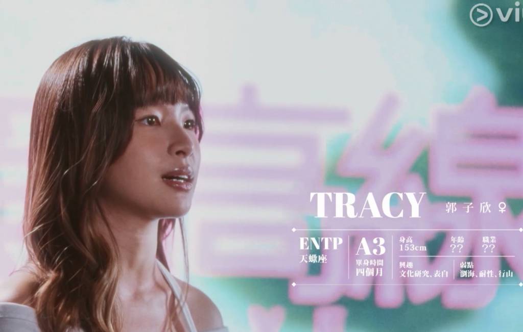 參賽者Tracy郭子心身高153,感情狀況為A3,單身4個月,MBT為ENTP。Tracy指自己比較喜歡鼻子高、眼睛大;內在就搞笑幽默的男生。被節目介紹為「勇於試錯的表白高手,全方位的母性導航」,單身4個月的她興趣是文化研究和表白。節目形容她「不需要你成為英雄,但你的眼中,最好不要出現另一個人的身影」,展現出對感情專一的要求。這位充滿母性光輝的參賽者,似乎準備在高山峻嶺中發揮她的表白技巧,尋找心目中的理想對象。