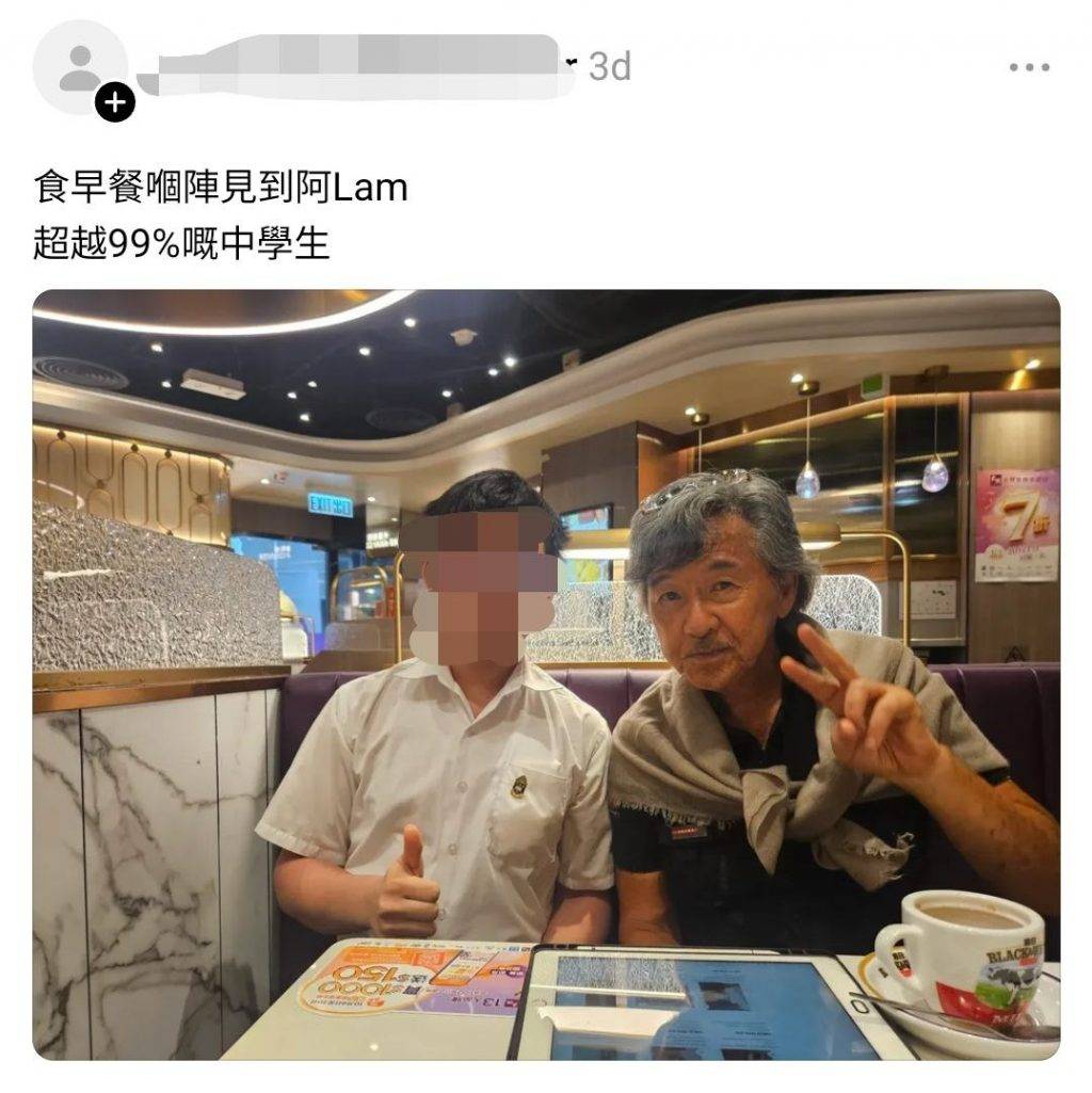 日前有位中學生在社交平台Threads上載了一張與林子祥的合照,瞬間引起網絡關注。從照片可見,當時兩人身處一間地道的茶餐廳,林子祥打扮休閒,毫無巨星架子。面對年輕粉絲的集郵邀請,他不但沒有拒絕,更非常親民地將頭靠向對方,並舉起V字手勢展露微笑,可愛的舉動被網民大讚。該名中學生興奮地在帖文中寫道:「食早餐嗰陣見到阿Lam,超越99%嘅中學生」,字裡行間流露出偶遇偶像的喜悅,沒想到這句話竟成為網民討論的開端。