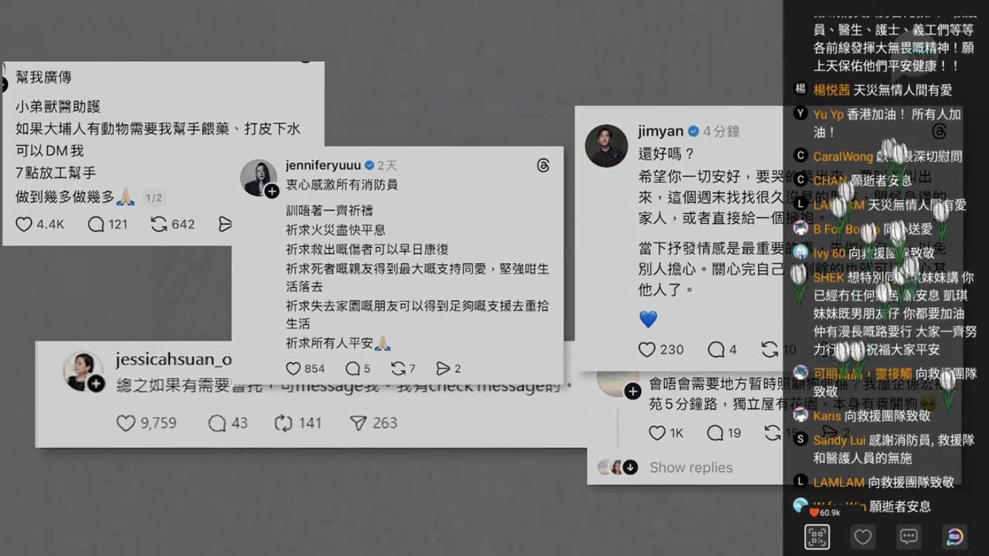 節目播出後引起巨大迴響,大批網民湧入留言區洗版,為受災市民及前線人員打氣。不少留言都為死傷者送上祝福:「願逝者安息一路好走,願生者早日走出傷痛,重新振作,早日重建家園」、「願每一位受災居民加油向前走」。同時,亦有大量網民向所有救援人員表達最崇高的敬意:「衷心感謝消防人員英勇衝上火場救人」、「感激前線救援人員包括義工,日以繼夜幫助居民」,每一句留言都充滿了力量與關懷,展現了風雨同舟的香港精神。
