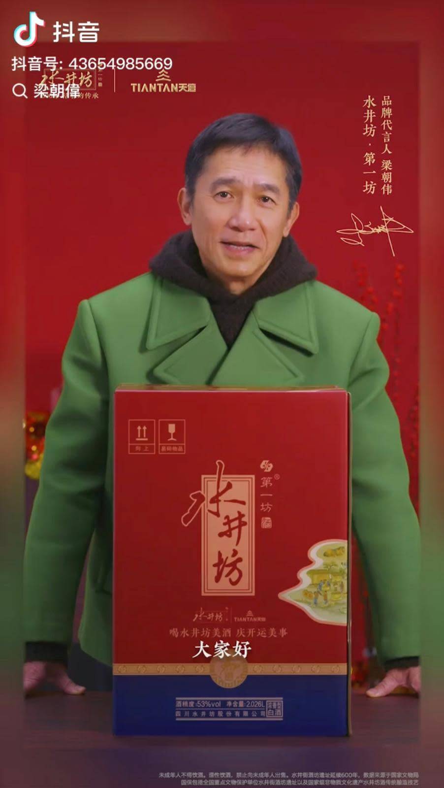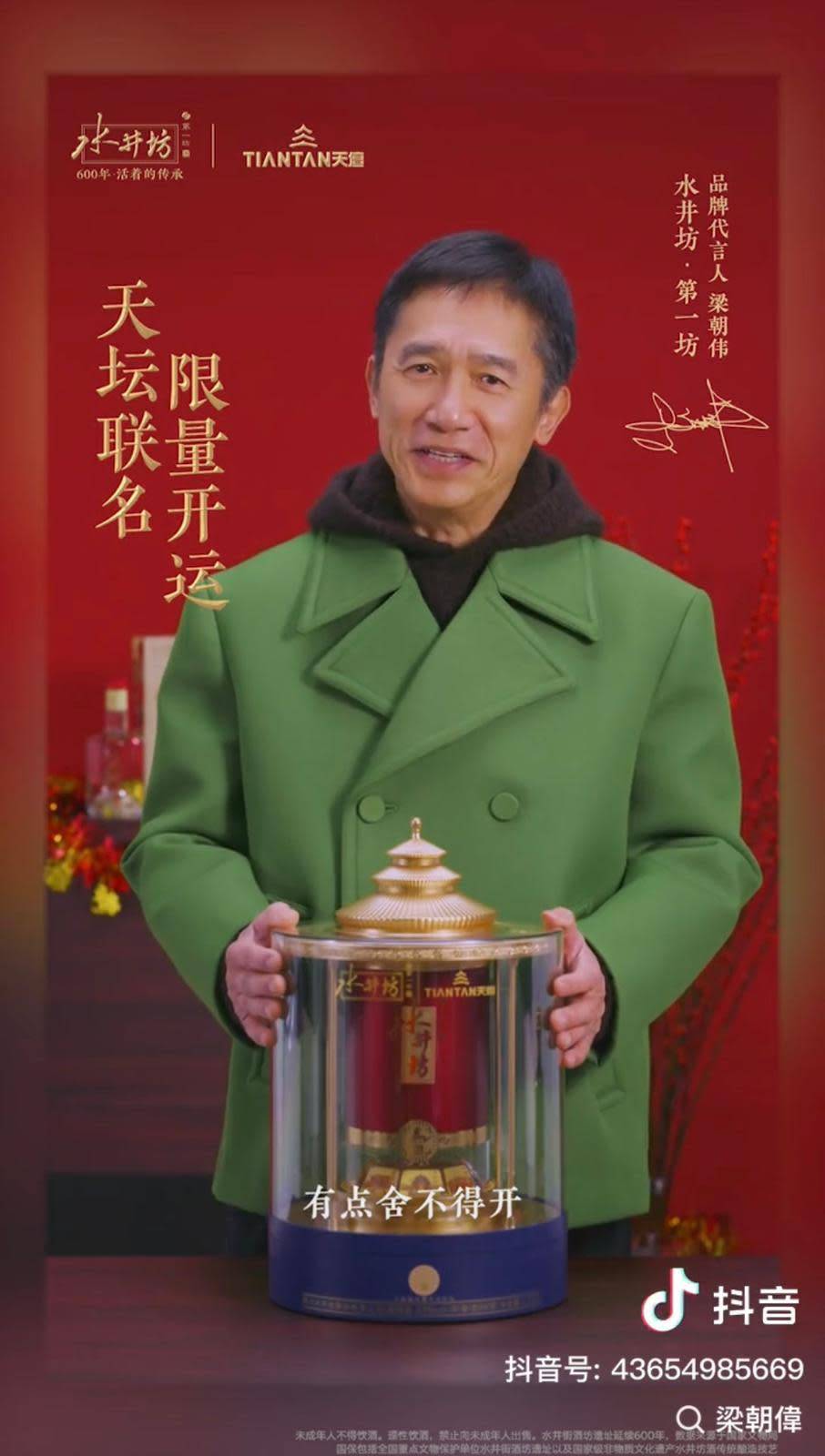 廣告片段中,梁朝偉全程以普通話對鏡頭興奮地說:「春節快到了,我想跟大家分享一個好東西!」隨即展示一個大型紅色禮盒,表現得十分雀躍,更七情上面地說:「開箱我還是第一次」、「嘩!這麼大一壇」、「感覺喝了這個開運酒,就接了天壇的好運!」整個過程中梁朝偉笑容滿面,與平日在鏡頭前的內斂形象形成強烈對比,令不少粉絲都感到不敢置信。