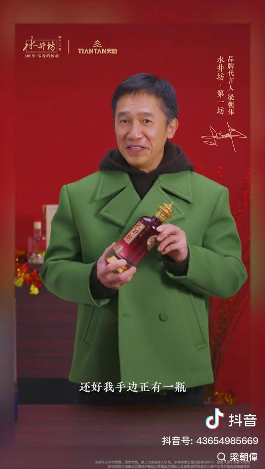 63歲影帝梁朝偉近日為內地白酒品牌拍攝賀年廣告,片中一改往日社恐形象,身穿綠色軍褸興奮推銷「開運酒」,熱情程度令網民大感震驚,紛紛質疑「這真的是那個社恐男神嗎?」更有人懷疑是AI合成效果。這位入行超過四十年的金像影帝,向來以內向沉靜見稱,曾親認患有社交恐懼症,甚少在公眾面前展現如此活潑一面,今次突然變身熱情推銷員,反差之大令人咋舌。