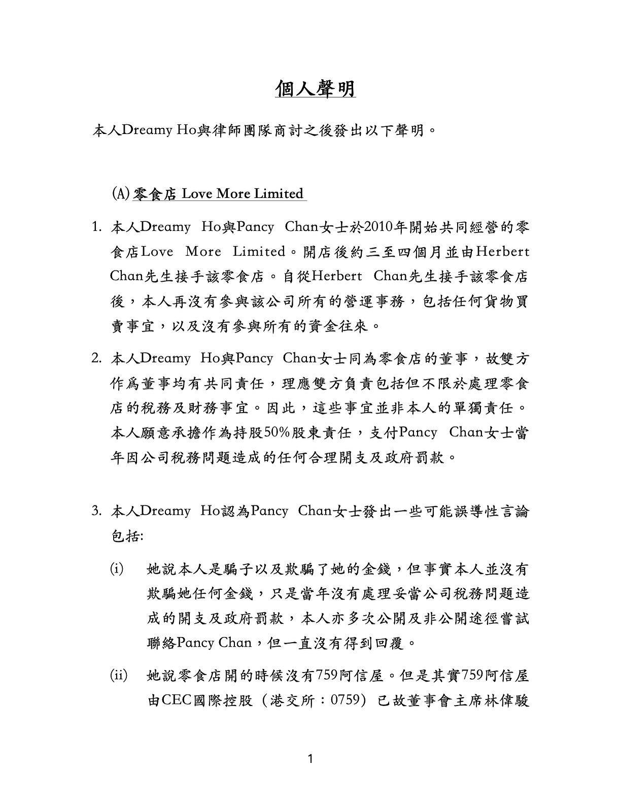 何小姐在直播尾聲嚴正聲明,開完這次直播後,將不會再作任何個人回應,「我今天開完這個直播,說完我要說的話之後,我將所有相關人士對我作出這些不實指控、失實指控的相關人士,我會全部將他們的相關資料,交給我的代表律師。」她希望傳媒不要再為了流量去報導未經證實的資訊,亦不要再騷擾其家人朋友。
