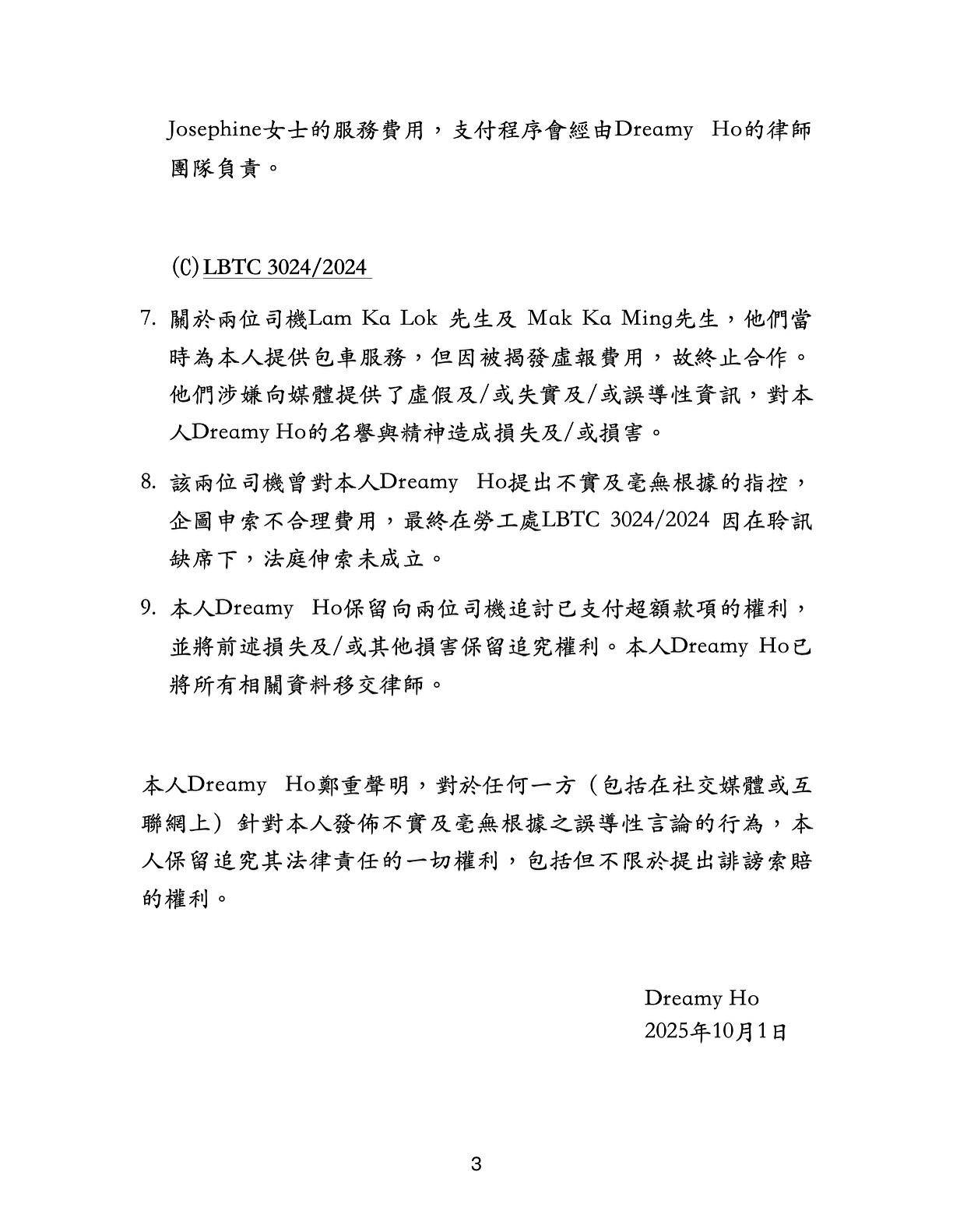 對於兩位自稱「苦主」的司機,何小姐澄清他們並非員工,而是以每月五萬元的費用「包車」。她透露其中一位司機總共收取了四十二萬五千五百元車資,另一位亦收取了三十七萬五千元。她更指控對方多收了六萬多元車資,「當時家樂收到的錢是四十二萬五千五百元的車資,而另外一位自稱苦主的是三十七萬五千元的車資,其實最後我們計算出來的數,其實他們多收了我六萬多元。」她又指對方曾告上勞工處,但因缺席而被判敗訴。她怒斥對方「貪得無厭」,因未能榨取更多金錢而「懷恨在心」,向傳媒提供失實資料誣告她。
