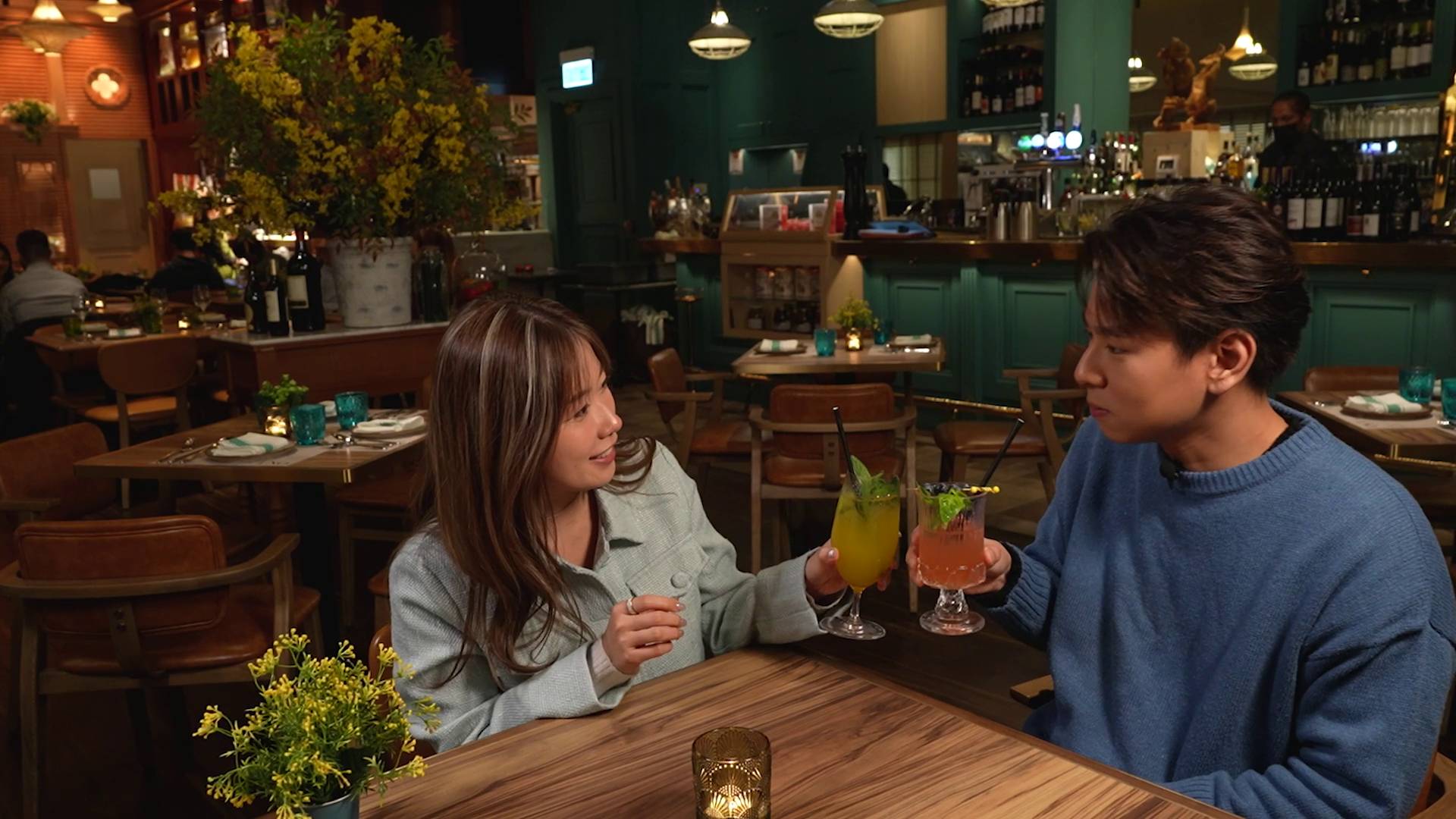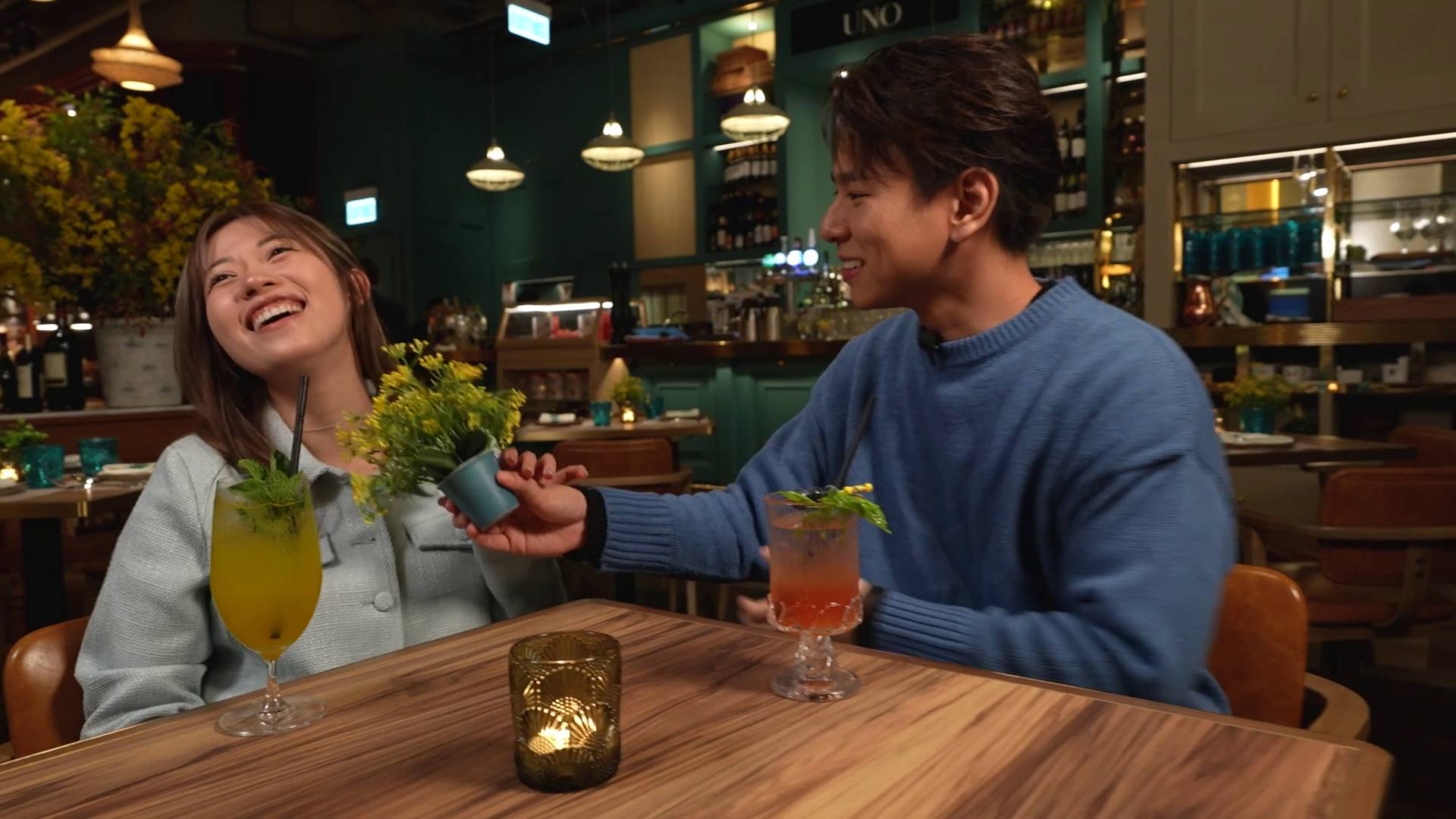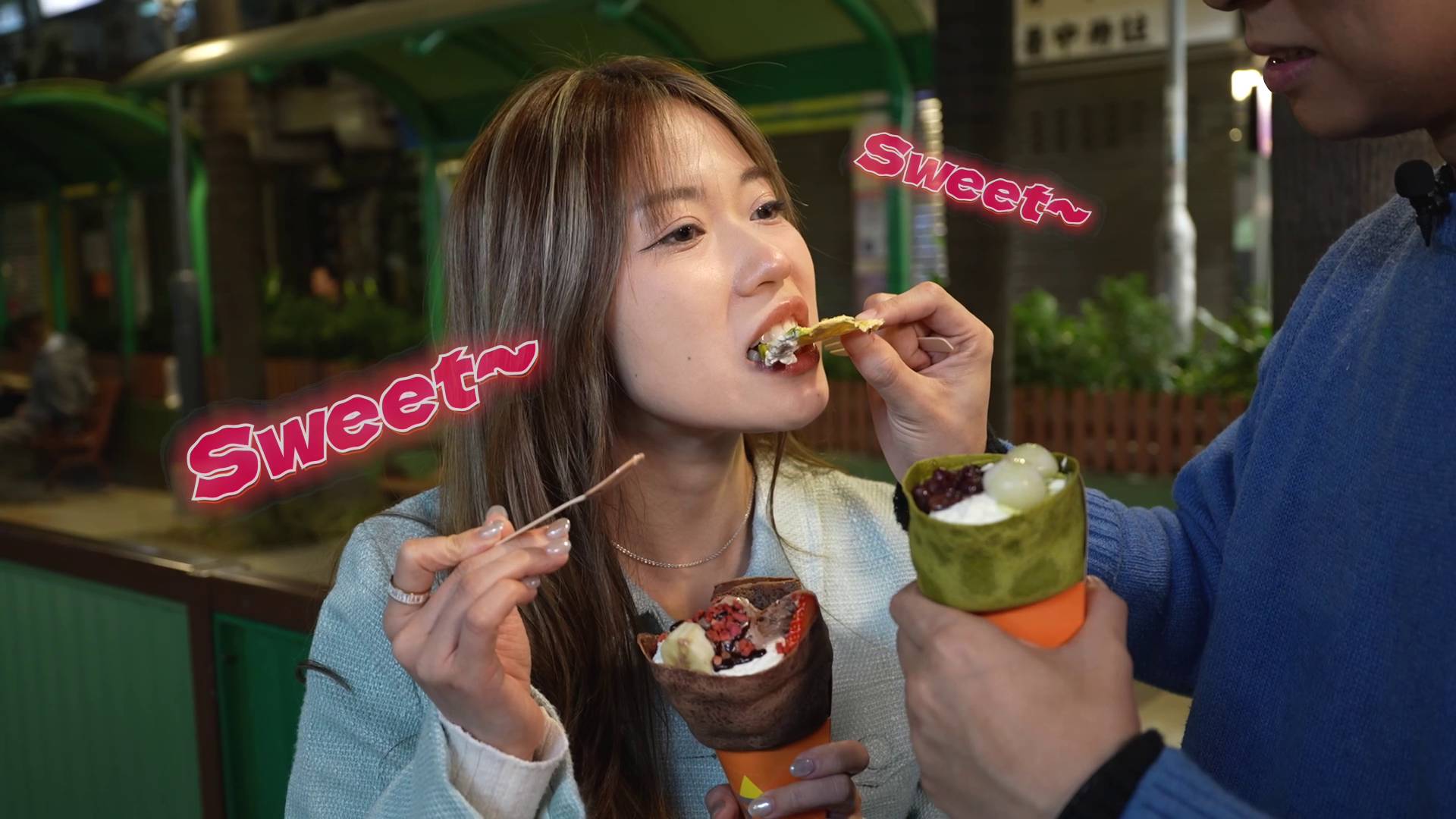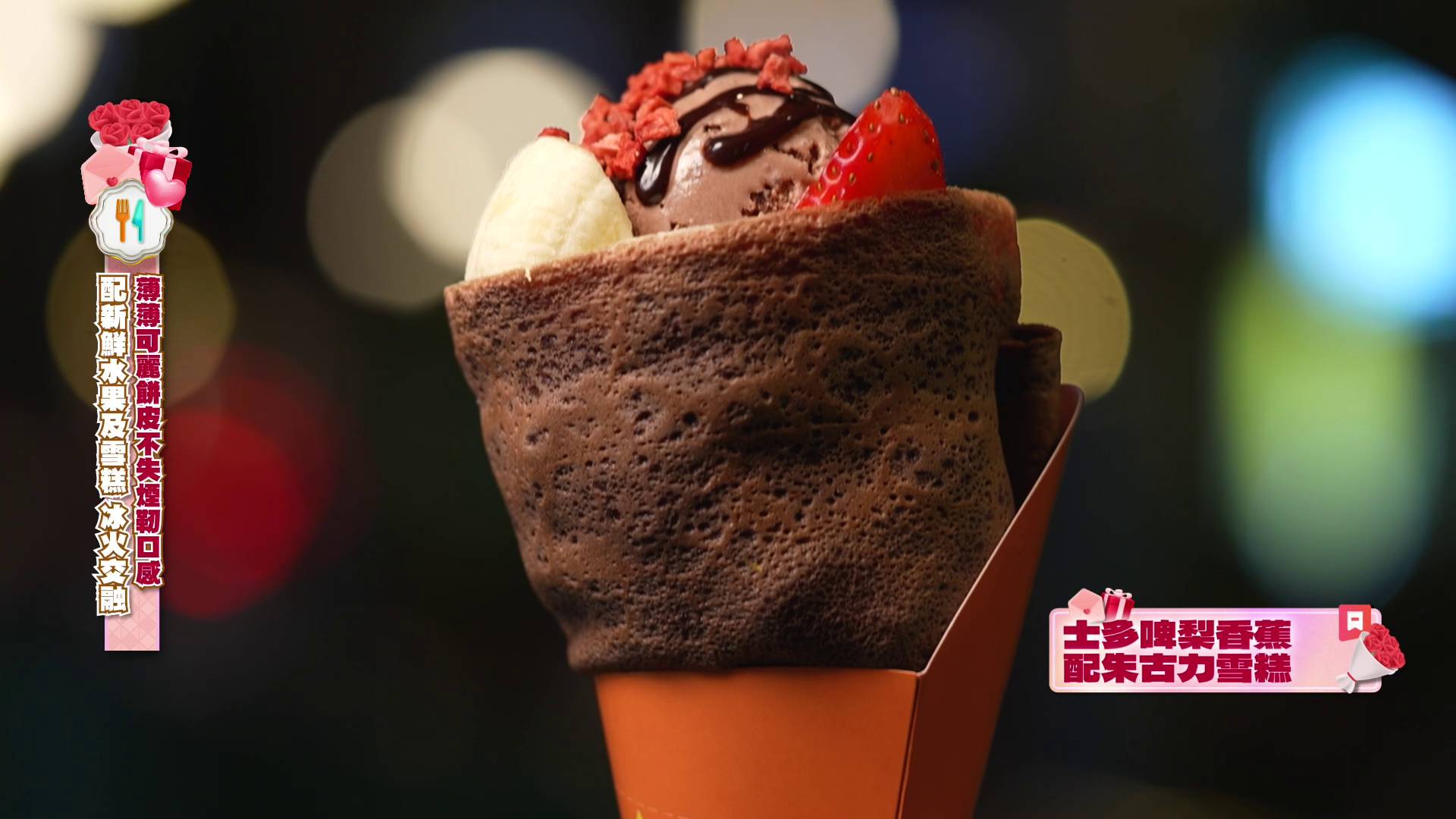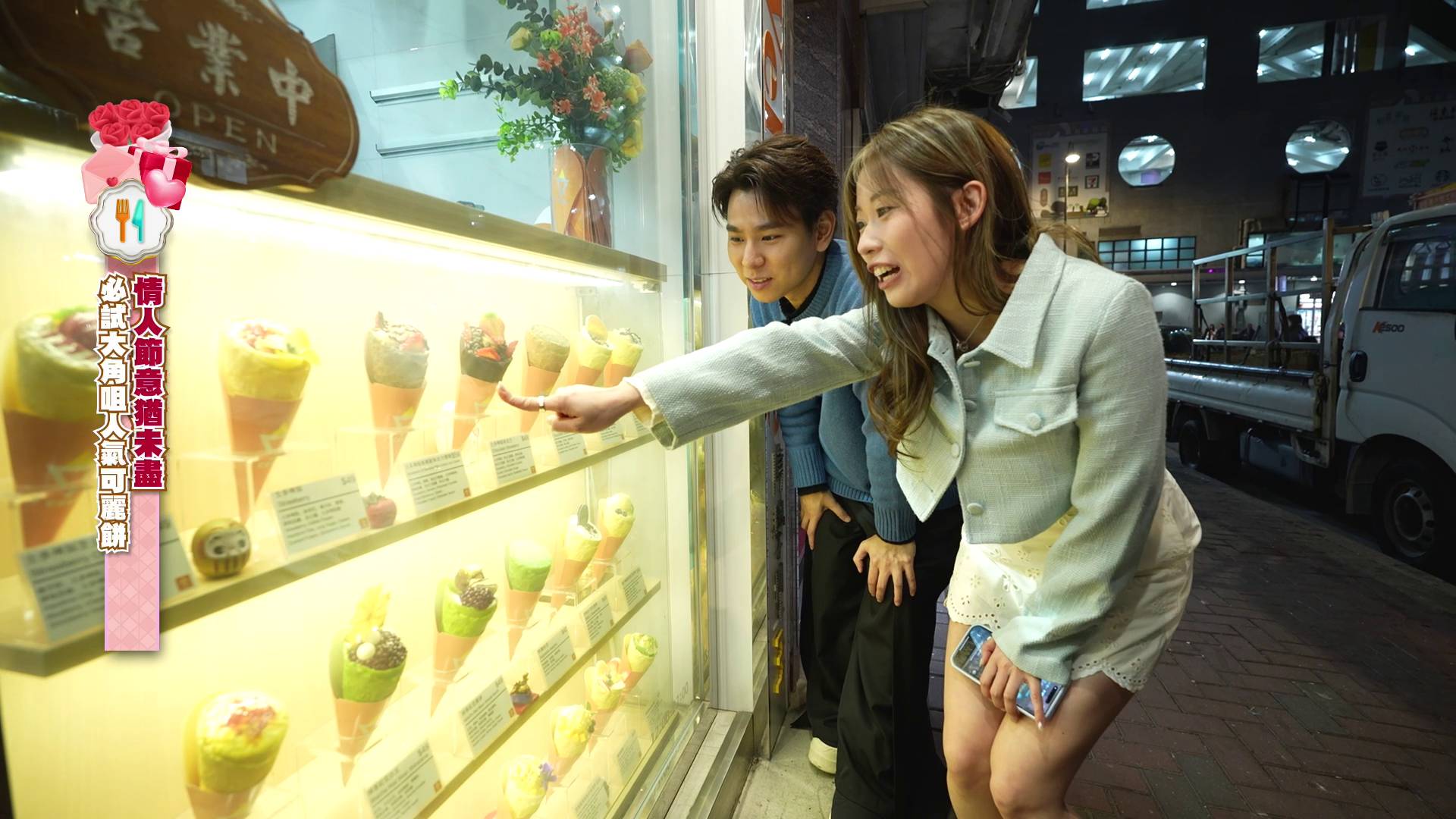 飽餐一頓後,甜蜜行程尚未結束!行仔鬼馬地送上一盆小盆栽代替傳統花束,預祝波波佳節快樂,心思滿滿。隨後,兩人轉場到區內人氣爆燈的可麗餅(Crêpe)店歎甜品,分別點了士多啤梨香蕉配朱古力雪糕及抹茶紅豆白玉口味。鏡頭前兩人更甜蜜地分食一塊菠蘿乾,情侶感十足,完美完成一日限定的約會任務,畫面充滿粉紅泡泡,令觀眾都感受到他們的甜蜜氣氛。