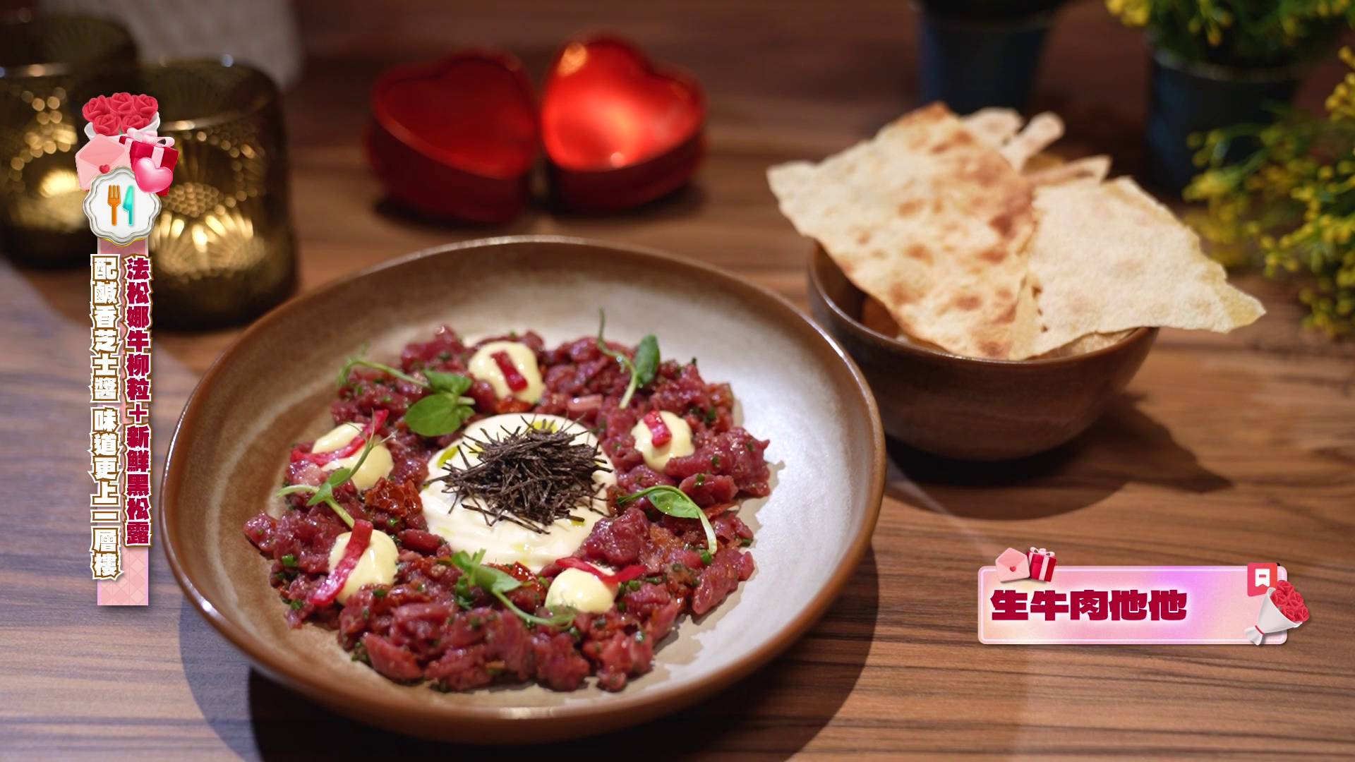 節目中,行仔與波波來到大角咀一間氣氛浪漫的西餐廳,品嚐豐富的情人節套餐。身為「芝士狂人」的波波,一見到頭盤「法松娜牛柳粒配新鮮黑松露」上的芝士醬已心心眼,大讚味道更上一層樓。而接下來的招牌海鮮薄餅更徹底俘虜她的心,她指著滿瀉的芝士興奮地說:「成碟都係海鮮,最緊要啲芝士滿瀉出嚟。我食 pizza 最緊要係個芝士,呢個簡直擊中我要害。」隨後的西冷牛肉薄切和黑松露細扁麵同樣鋪滿芝士,讓波波全程食得心滿意足,幸福感爆棚!