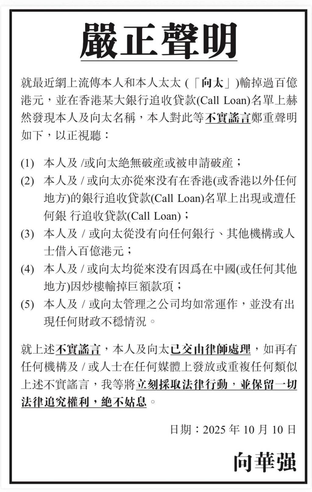 向華強今日以其本人署名,在本港報章發布一份公開聲明,聲明內容為:「就最近網上流傳本人和本人太太(「向太」)輸掉過百億港元,並在香港某大銀行追收貸款(Call Loan)名單上赫然發現本人及向太名稱,本人對此等不實謠言鄭重聲明如下,以正視聽:(1)本人及/或向太絕無破產或被申請破產;本人及/或向太亦從來沒有在香港(或香港以外任何地方)的銀行追收貸款(Call Loan)名單上出現或遭任何銀行追收貸款(Call Loan);(3)本人及/或向太從沒有向任何銀行、其他機構或人士借入百億港元;(4)本人及/或向太均從來沒有因為在中國(或任何其他地方)因炒樓輸掉巨額款項;(5)本人及/向太管理之公司均如常運作,並沒有出現任何財政不穩情況。就以上不實謠言,本人及向太已交由律師處理,如再有任何機構及/或人士在任何媒體上發放或重複任何類似以上不實謠言,我等將立刻採取法律行動,並保留一切法律追究權利,絕不姑息。」
