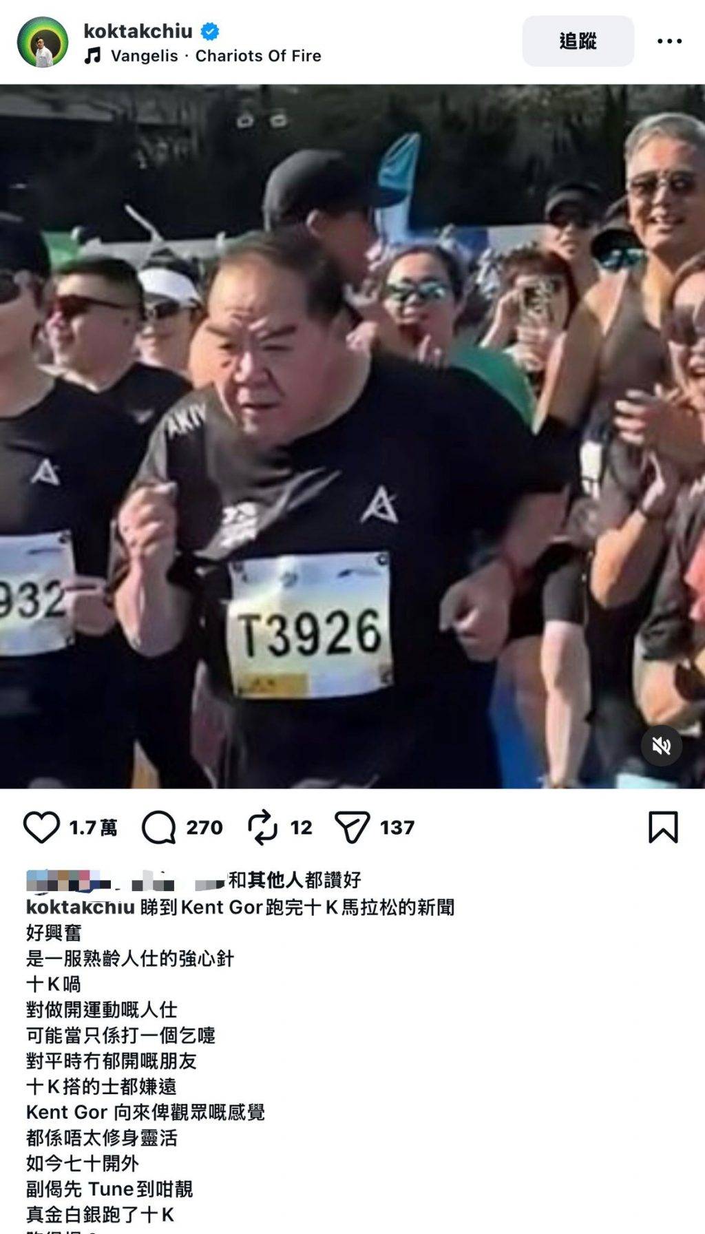 鄭則仕 渣打馬拉松 74歲肥貓鄭則仕完成10K挑戰!(圖片來源:Threads圖片)