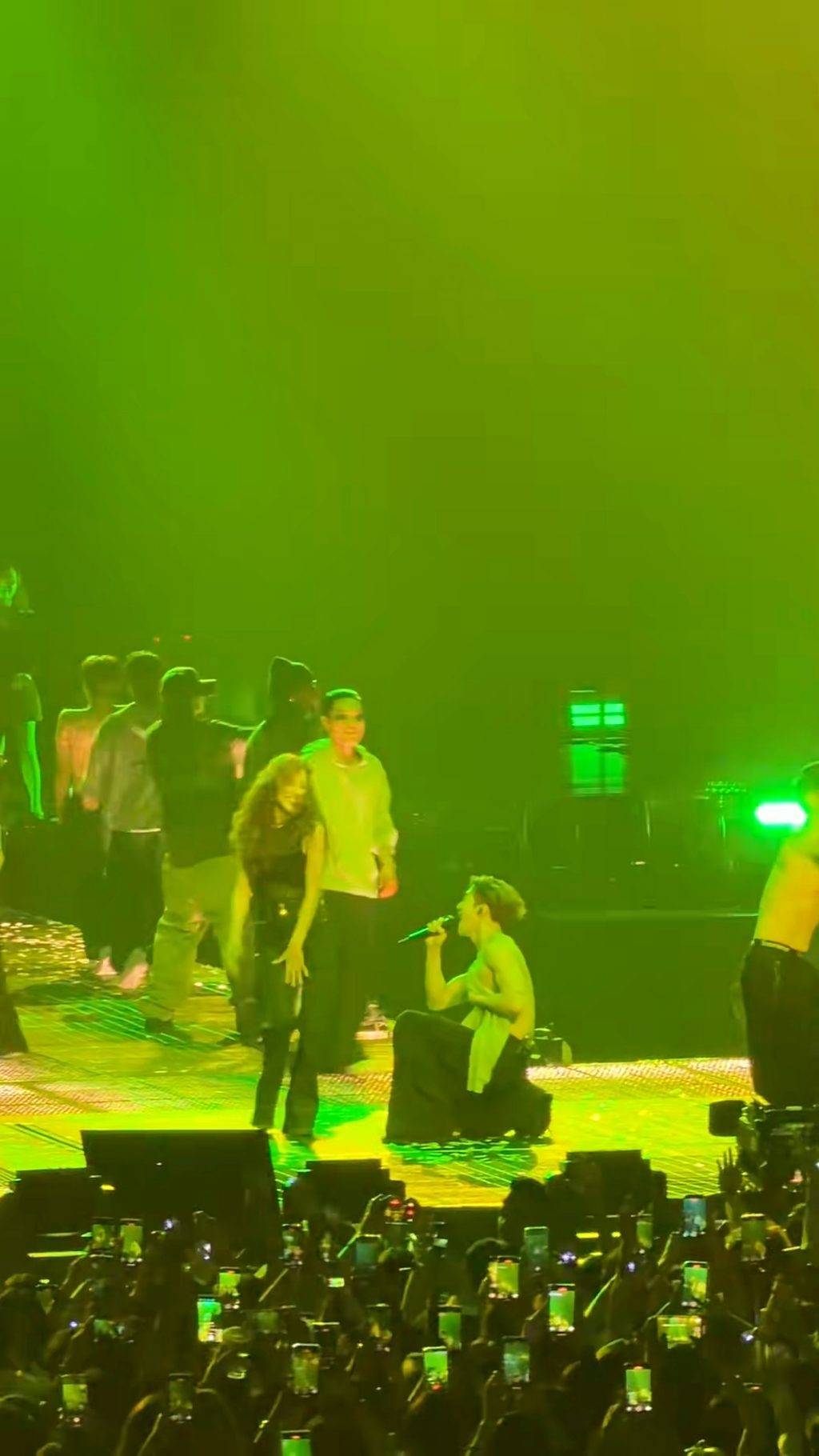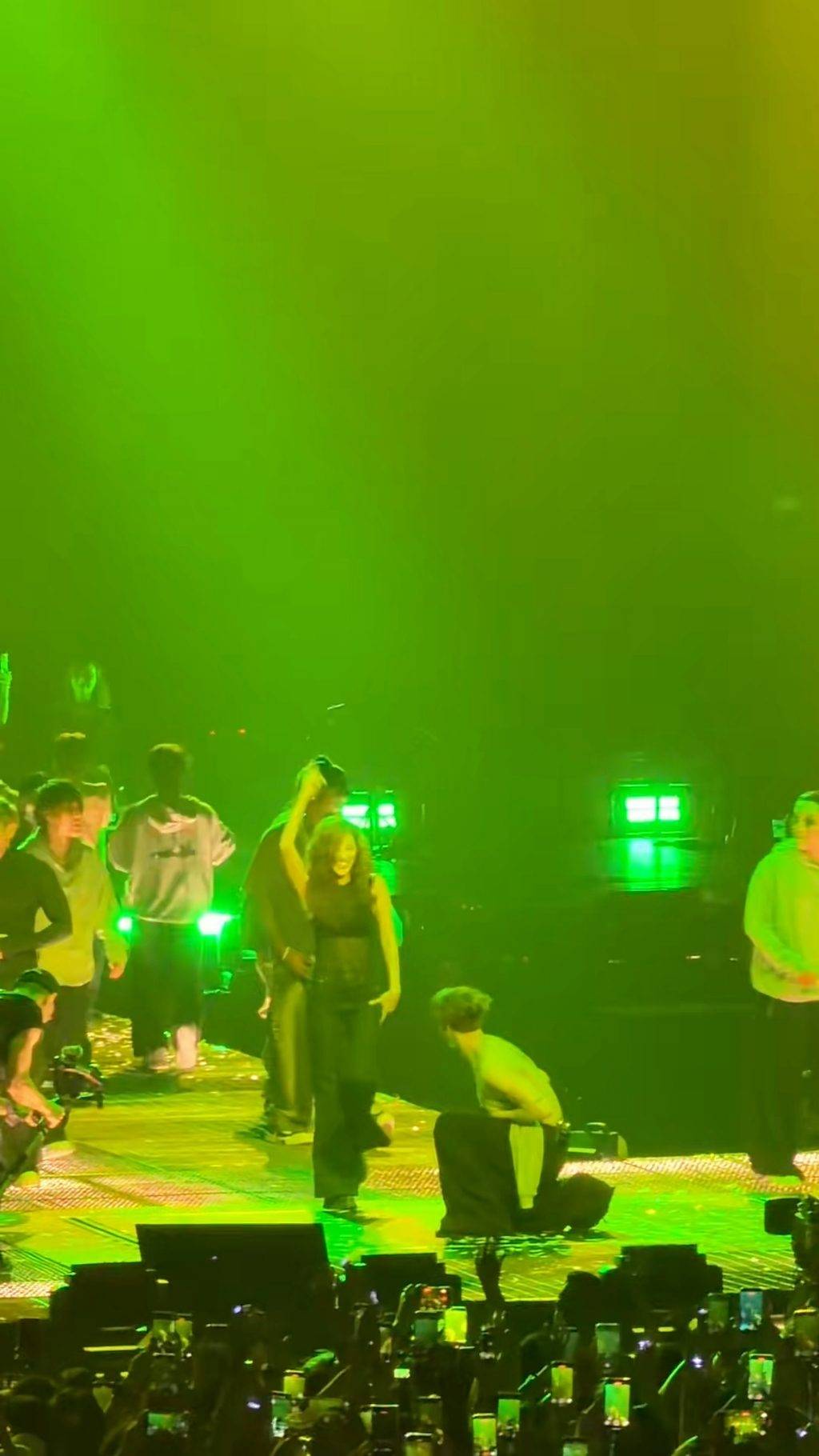 王嘉爾澳門演唱會進行期間,突然走到台邊蹲下身,溫柔地向台下某位觀眾深情說道:「感謝你,我哋公主今日嚟到現場啊!」鏡頭一轉,原來被稱為「公主」的竟是前港姐冠軍陳凱琳。她聽到這突如其來的稱呼後,瞬間「迷妹」上身,笑得燦爛又帶點羞澀,輕輕掩著心口表達謝意。王嘉爾更主動伸出手臂,邀請這位「公主」上台互動,場面溫馨又浪漫。