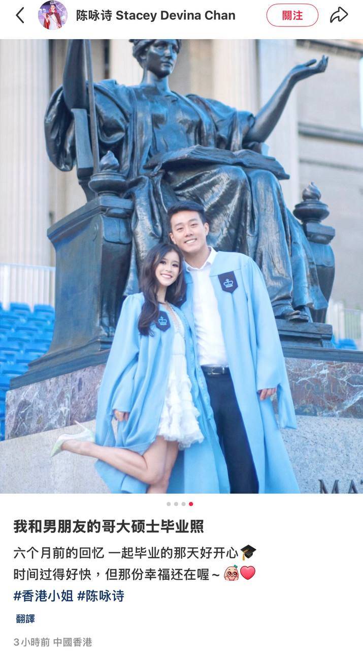 陳詠詩在社交平台分享了一張與男友Martin的哥倫比亞大學畢業合照,並配文寫道:「我和男朋友的哥大碩士畢業照,六個月前的回憶,一起畢業的那天好開心,時間過得很快,但那份幸福還在喔~」相片中她身穿深V短裙配搭藍色畢業袍,與男友緊密攬抱,兩人臉上洋溢著幸福笑容。這是陳詠詩首次公開展示與男友的正面合照,立即在網上掀起熱烈討論,不少網民都被這對金童玉女的顏值震撼。