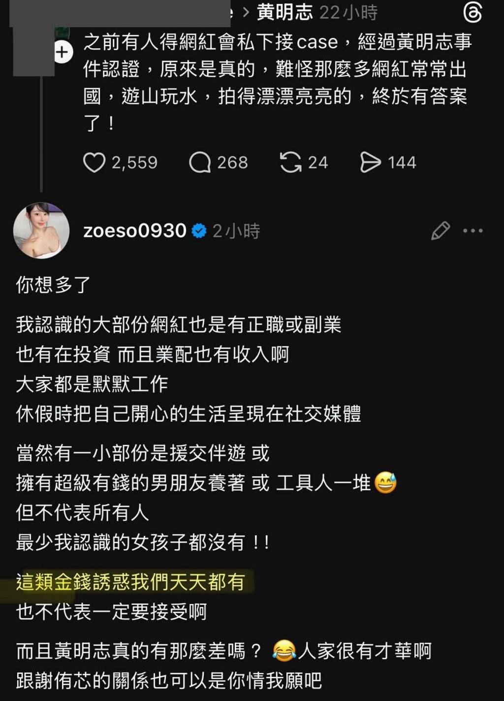 蘇小小還自爆這類金錢誘惑我們天天都有:「也不代表一定要接受啊而且黃明志真的有那麼差嗎?人家很有才華啊,跟謝侑芯的關係也可以是你情我願吧。」她還澄清自己從事副業包括:花店店主、攝影棚店主和DJ。