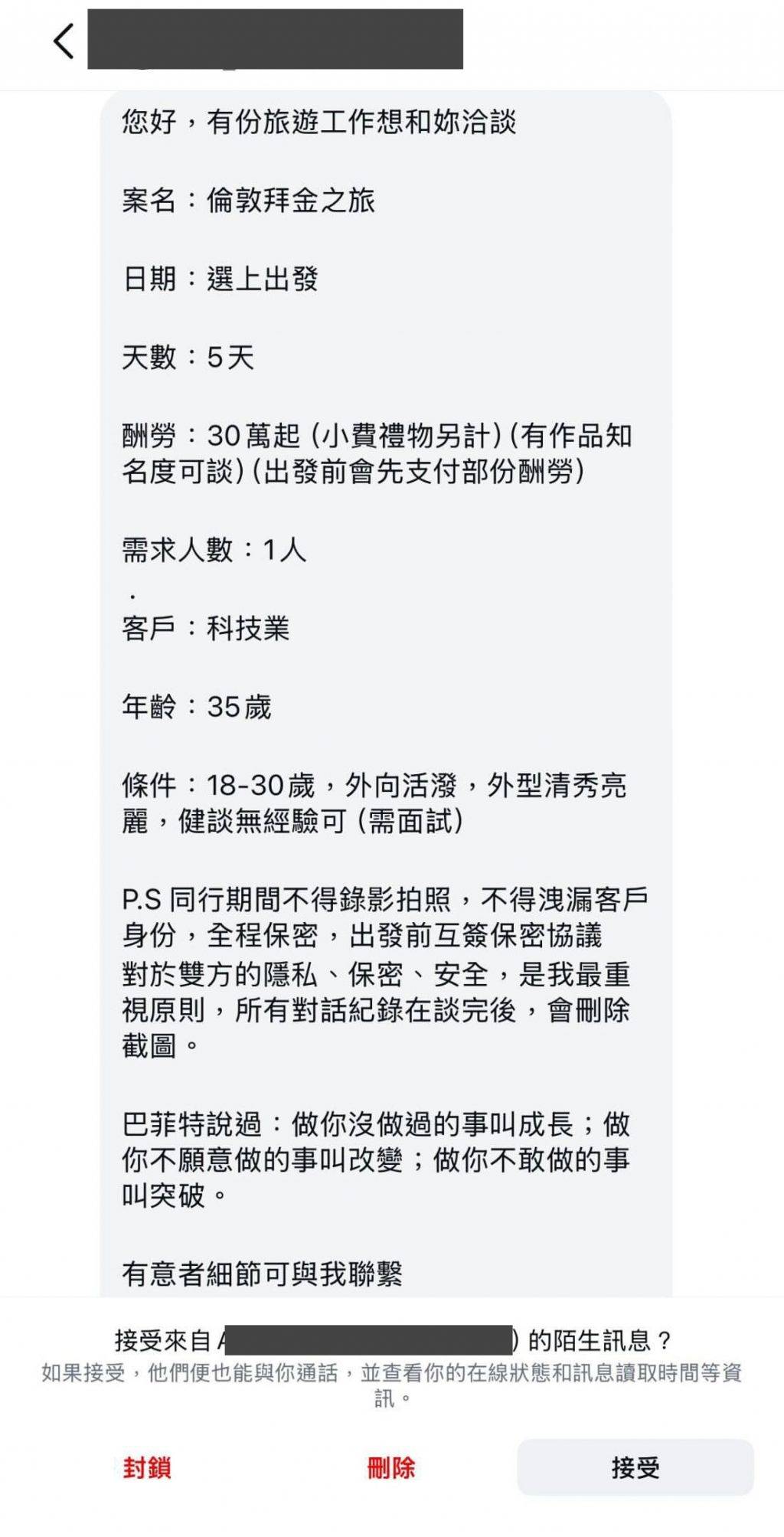 網紅蘇小小曝光30萬倫敦拜金邀約