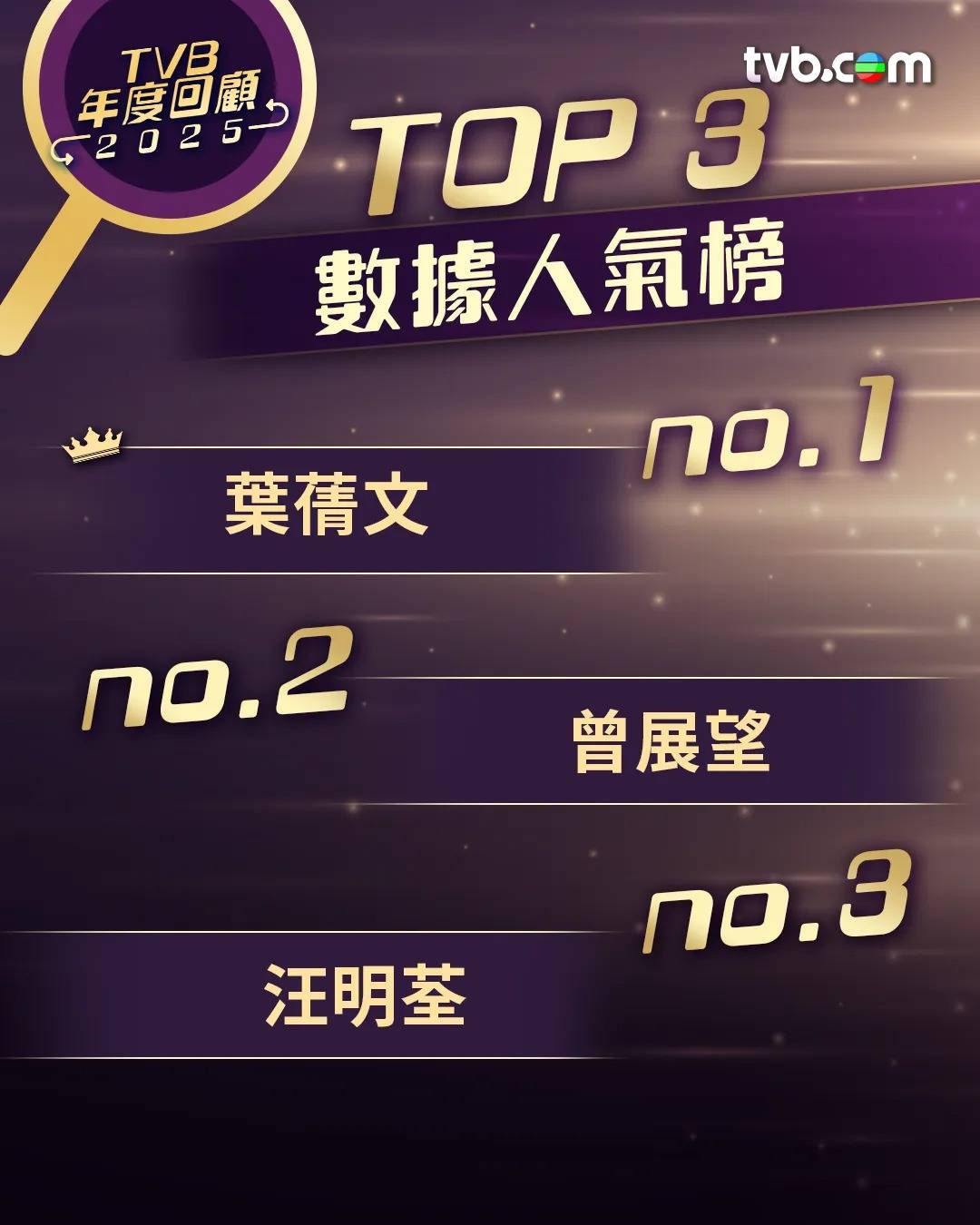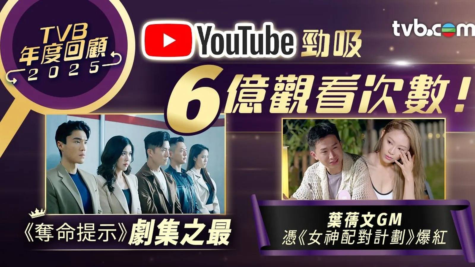 節目的成功亦直接帶挈藝人人氣急升!根據TVB自家平台的數據分析,2025年度數據人氣榜的榜首位置,由憑藉《女神配對計劃》贏盡全城關注的葉蒨文及曾展望霸佔,兩人真摯的互動成為網絡熱話。排在他們之後的,則是相隔17年再拍旅遊綜藝《帶阿姐看世界》的汪明荃、在《新聞女王2》中霸氣逼人的佘詩曼,以及在《奪命提示》中憑最強Body躍升為「新一代打女」的劉穎鏇。這份名單反映了去年不論是話題情侶、阿姐級藝人、視后級演員還是新生代打女,都能夠憑藉出色表現俘虜觀眾心。