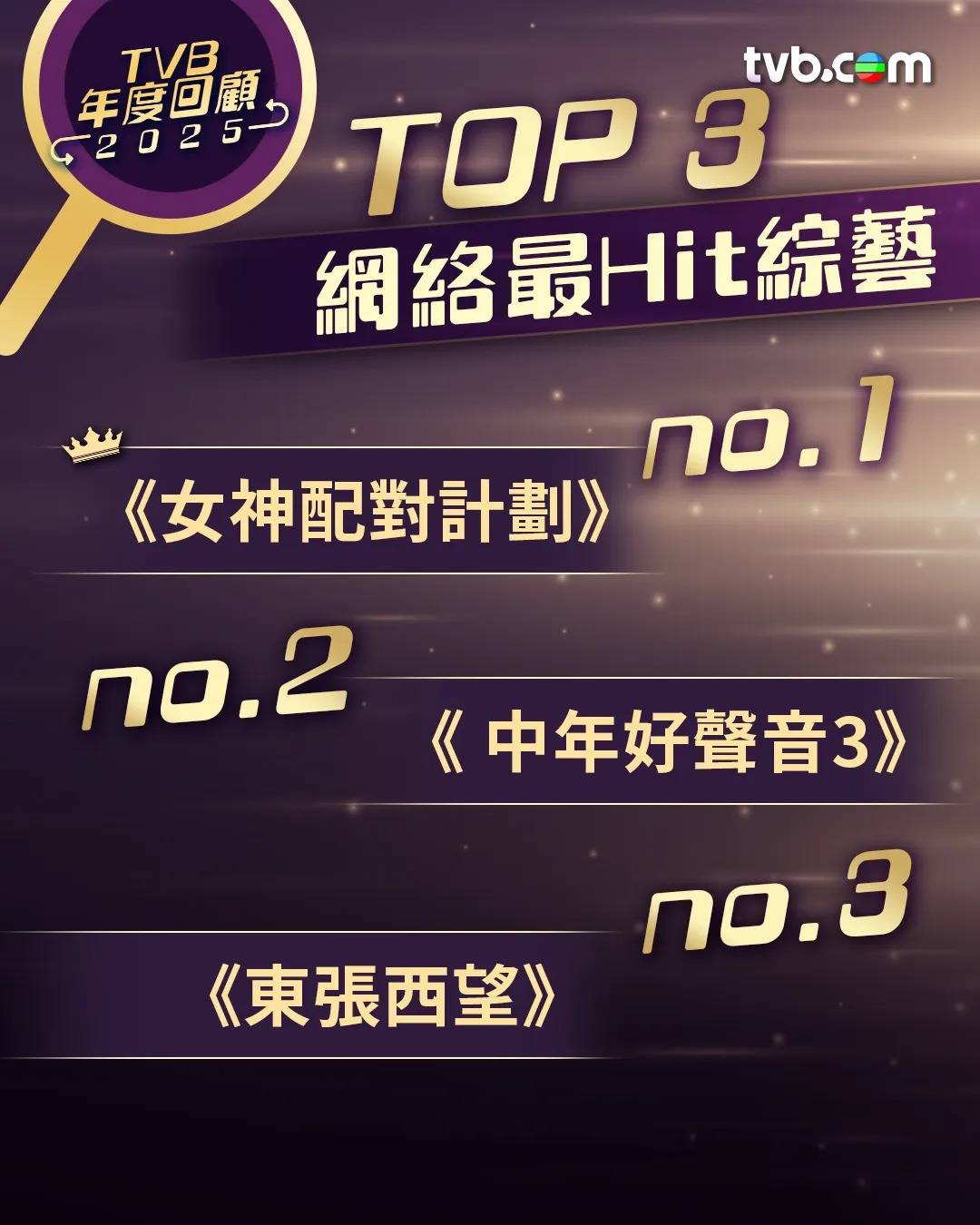 根據TVB官方公布的「TVB 網絡年度回顧 2025」,去年網絡表現最好的節目及劇集正式揭曉。在影片播放次數方面,《中年好聲音3》憑藉參賽者們的動人歌聲,成功累積了驚人的8,500萬播放次數,成為「年度片王」。緊隨其後的是話題戀愛綜藝《女神配對計劃》,錄得8,450萬次播放,而處境劇《愛.回家之開心速遞》亦以7,865萬次播放位列第三。不過,若計算社交平台的互動量(包括留言、分享及讚好等),冠軍則由《女神配對計劃》以約170萬次互動奪得,力壓錄得138萬互動的《奪命提示》及122萬互動的《新聞女王2》,可見其引發的討論度極高。