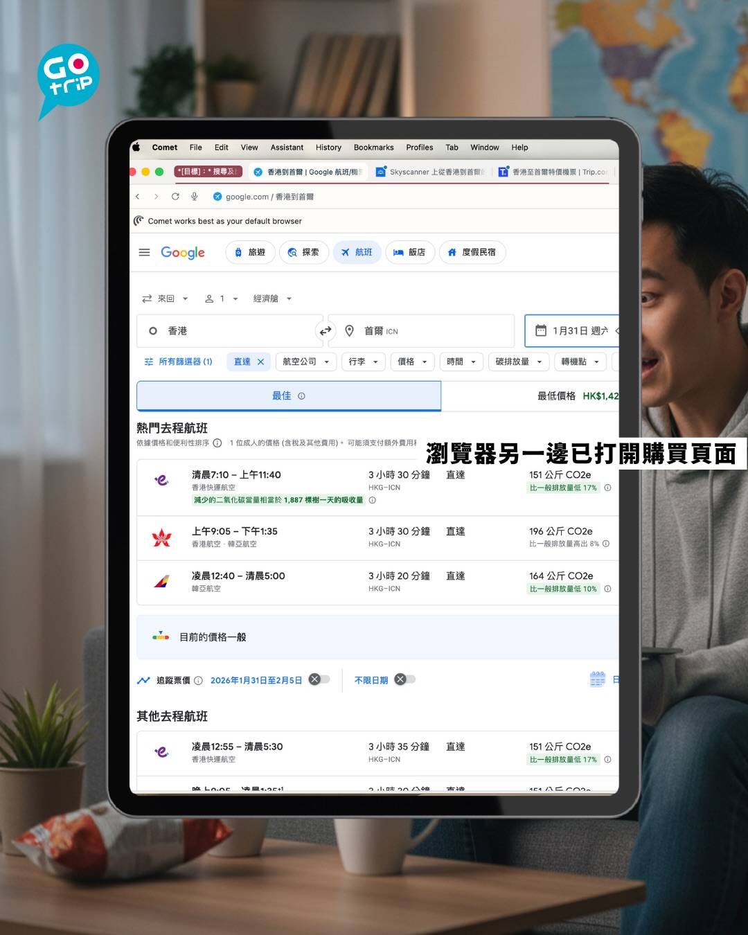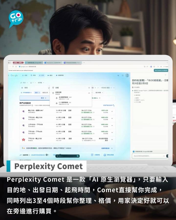 Perplexity Comet 是一款「AI 原生瀏覽器」,只要輸入目的地、出發日期、起飛時間,Comet直接幫你完成,同時列出3至4個時段幫你整理、格價,用家決定好就可以在旁邊進行購買。指令已放在留言區