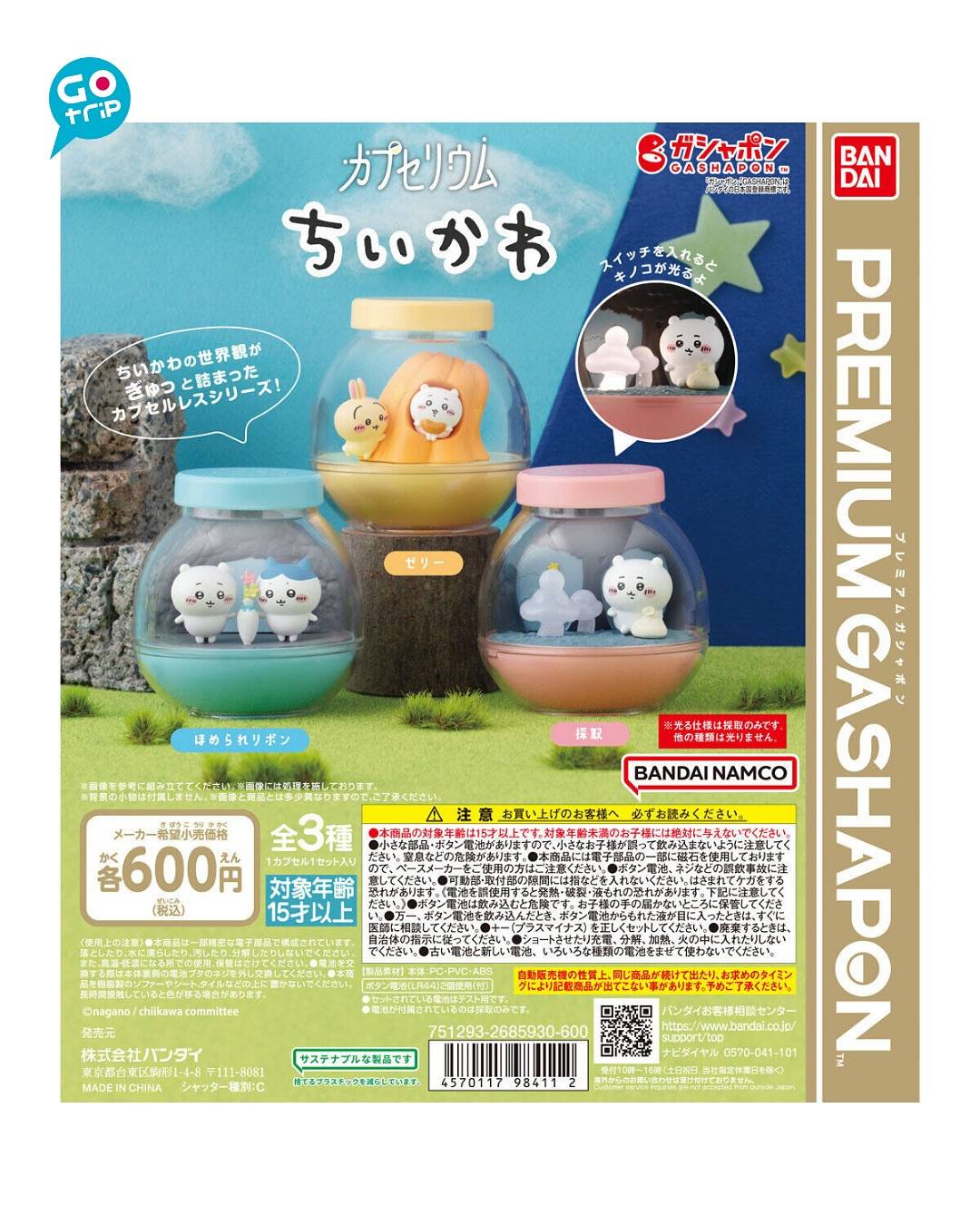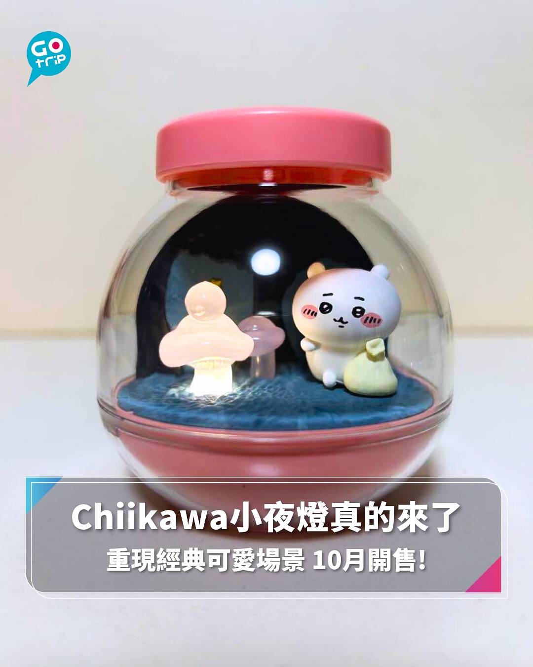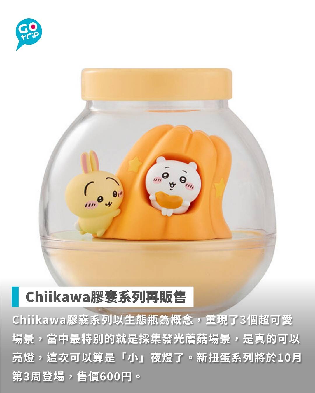 Chiikawa膠囊系列以生態瓶為概念,重現了3個超可愛場景,當中最特別的就是採集發光蘑菇場景,是真的可以亮燈,這次可以算是「小」夜燈了。新扭蛋系列將於10月第3周登場,售價600円。