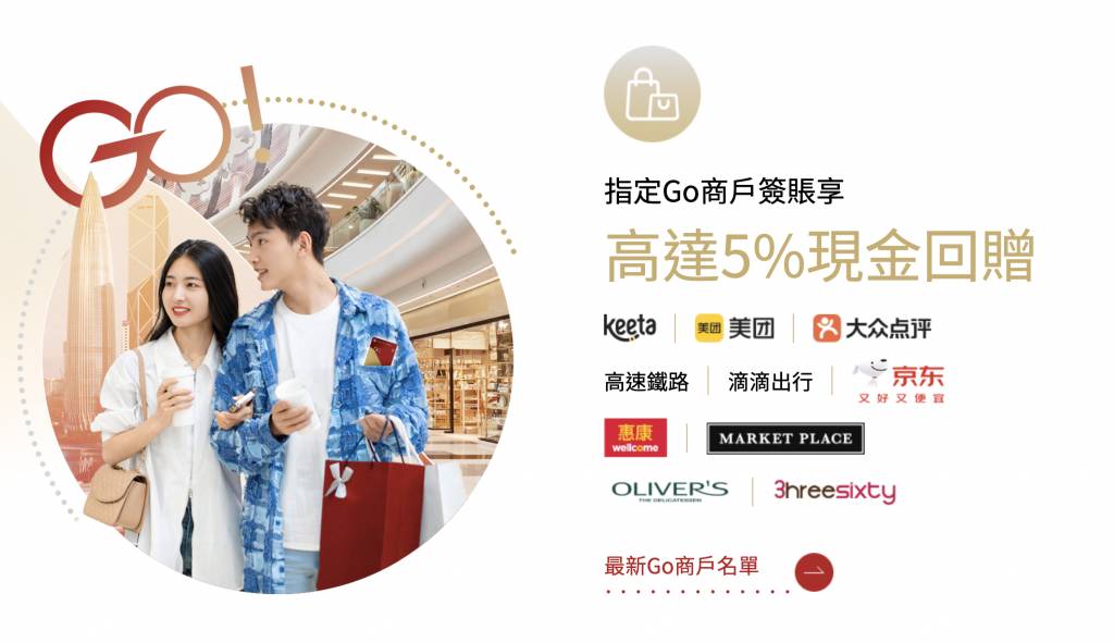 平日喺香港去超市買日用品或者偶爾叫吓外賣都在所難免!憑中銀Go卡,於指定Go商戶簽賬,即享高達5%現金回贈。當中包括:惠康、Market Place、Oliver’s the Delicatessen及3hreesixty,以上店舖都涵蓋日常生活所需,不論係買餸定日用品都可以一次過滿足到你!*