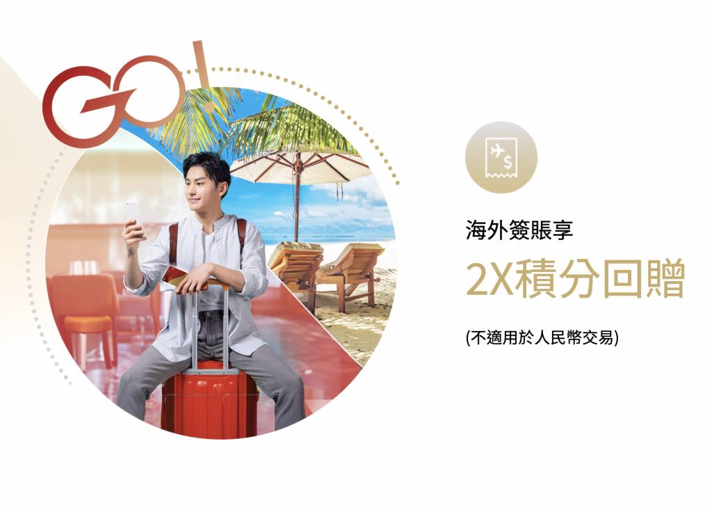 一邊喺海外旅行shopping,一邊都可以激賺回贈!喺海外使用中銀Go卡簽賬,即享無上限2X積分回贈,等於0.8%現金回贈㗎!配合埋最新「冬日Go賞」推廣,各階段累積海外零售簽賬滿HK$10,000再享HK$300回贈,即係等於3%現金回贈,總共賺高達3.8%回贈!
