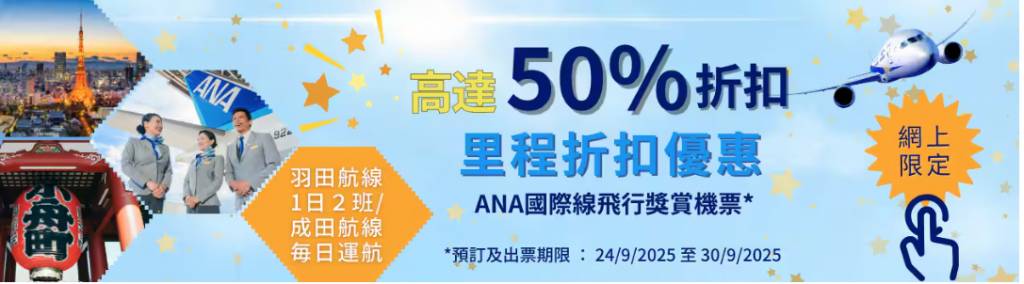 ANA半價里數換機票|香港至東京羽田的凌晨航班重新啟航以及成田航班班次增加, ANA推出半價里數換機票的方案,ANA里程俱樂部會員於兌換指定國際線航班的經濟艙獎賞機票時,可享高達50%里程折扣優惠,經濟艙來回原本17,000里,現時8,500里就換到飛往東京(羽田/成田)的機票,即睇詳情!