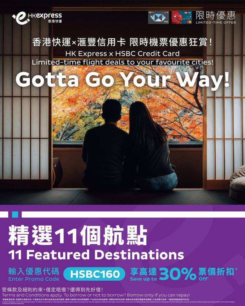 HK Express推出限時優惠,由即日起至2025年10月12日,11大航點大阪、高松、廣島、 亞庇(沙巴)、釜山、台北、富國島等航點有優惠!輸入優惠碼【HSBC160】並用指定滙豐信用卡付款,廣島、亞庇(沙巴)^即享高達30%折扣*票價優惠;大阪、福岡、高松、寧波、 貴陽、釜山、台北、富國島、峴港高達20%折扣*票價優惠。