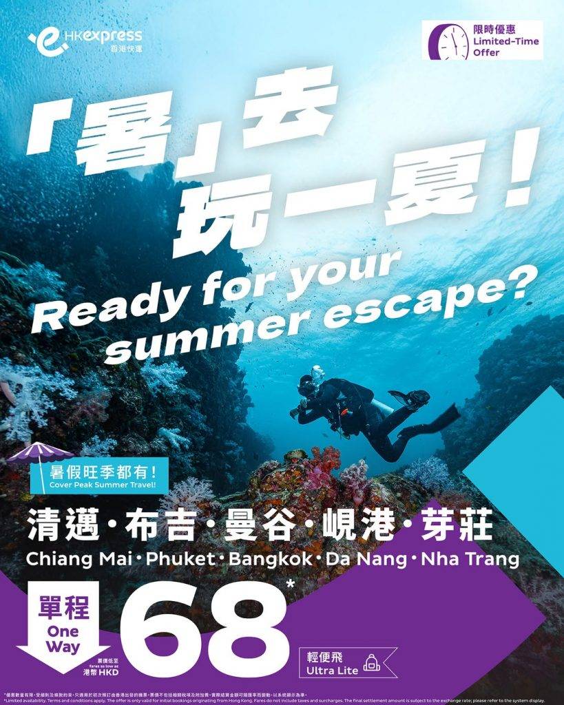 HK Express機票優惠|HK Express推出機票優惠,飛泰國曼谷、布吉、清邁、越南芽莊、峴港5大航點,低至$68,來回連稅$862,暑假期間都有優惠,趁平平地飛翻轉啦!