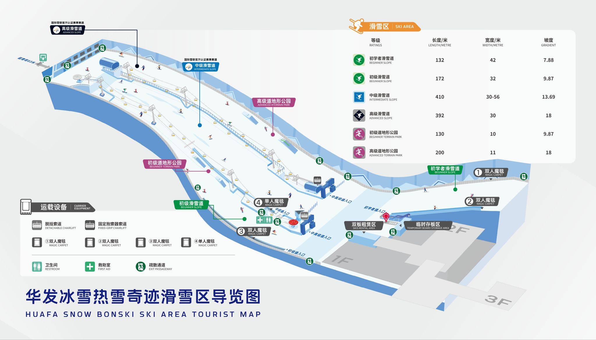 華發冰雪熱雪奇蹟是全球面積最大的室內滑雪場之一,配備5條初、中、高級滑道,最長單道463米,最高83米垂直落差,最大坡度18°。雪場亦正式通過國際滑雪聯合會(FIS)官方賽事賽道認證,成為國內首批獲此認證、具備舉辦國際雪聯職業滑雪賽事資質的室內雪場。全年可持續承接國內外大型賽事、專業競技隊集訓及大眾滑雪需求。