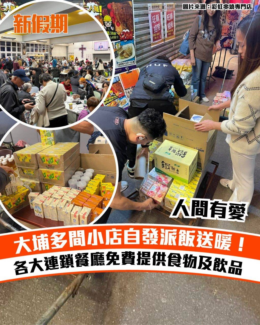 大埔宏福苑五級大火事件發生後,大埔多間小店及無數熱心街坊自發組織派發飯盒、水和生活物資支援受災居民。多間餐廳提供免費食物和物資,為災民帶來溫暖,充份體現香港人的互助互愛的精神。其中彩虹串燒專門店在社交媒體詳細報告各臨時庇護中心的情況,同時不停派發飯盒及物資;非區內小店「糖水雄」亦即晚暫停營業,把熟食全部捐贈給災民,並親自到現場提供全力支援。以及一眾岀錢岀力的餐廳、小店,包括:囍囍小廚、和拉麵、逸東餃子、水門雞飯、千之味壽司刺身專門店、膳心小館、堅信號、大埔振興肉丸等。