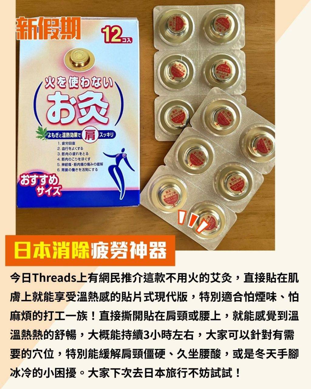 Threads上有網民推介這款不用火的艾灸,直接貼在肌膚上就能享受溫熱感的貼片式現代版,特別適合怕煙味、怕麻煩的打工一族!直接撕開貼在肩頸或腰上,就能感覺到溫溫熱熱的舒暢,大概能持續3小時左右,大家可以針對有需要的穴位,特別能緩解肩頸僵硬、久坐腰酸,或是冬天手腳冰冷的小困擾。大家下次去日本旅行不妨試試!