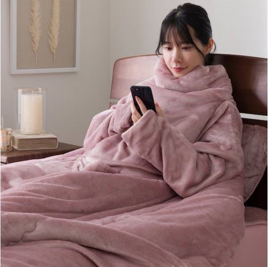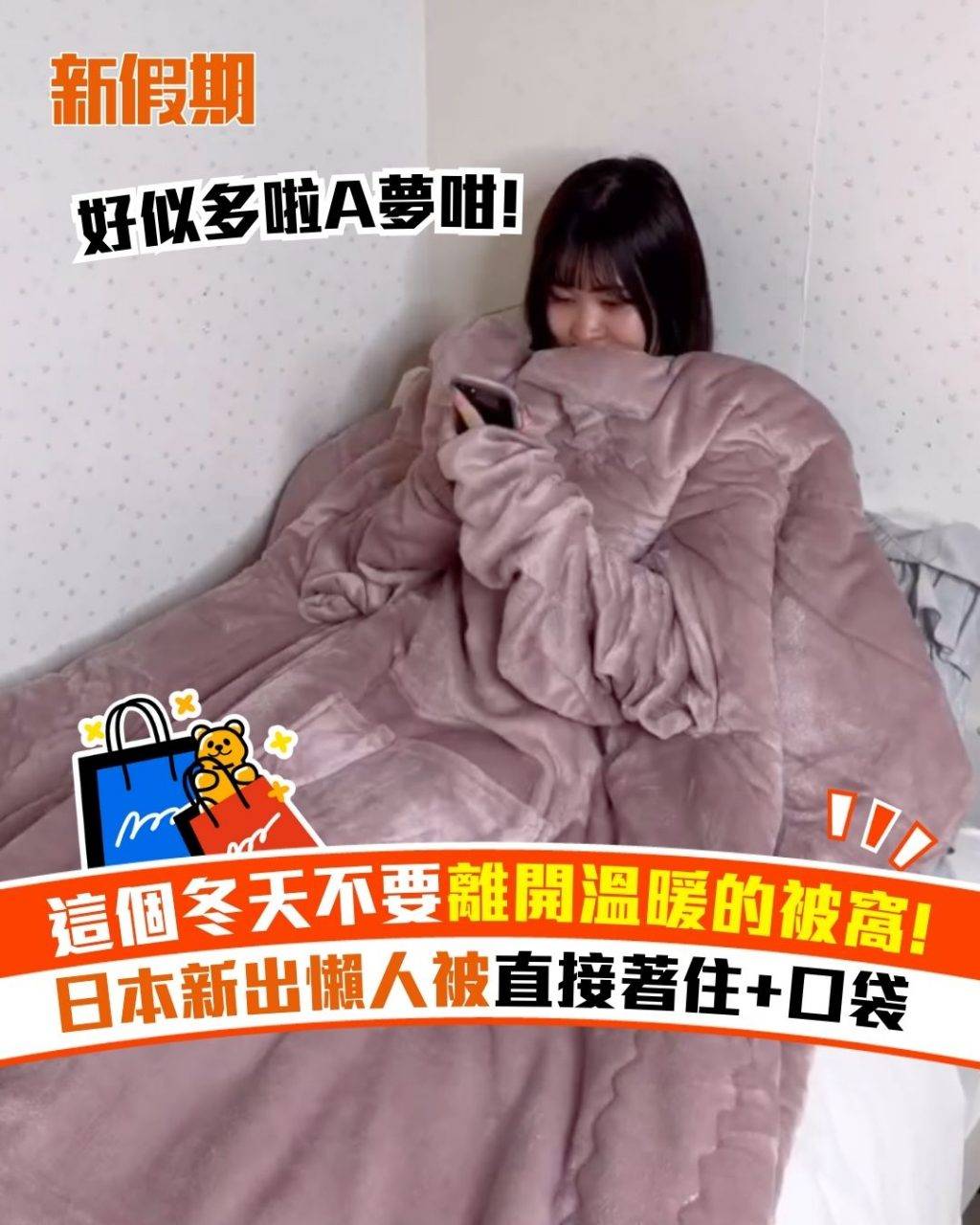 日本品牌Nitori 新出的懶人被是一款專為追劇、滑手機、在家chill 而設的袖套式保暖毛毯,包到暖笠笠,但雙手仍然可以自由用手機!前方自帶長袖設計,手臂伸出來玩手機、打字都不怕着涼,中間還有大口袋,可以放手機、遙控、紙巾等,躺著也方便拿取。背面設有扣子,扣上後毛毯會更貼身,不易從肩膀滑走,任何時候都可以暖笠笠!