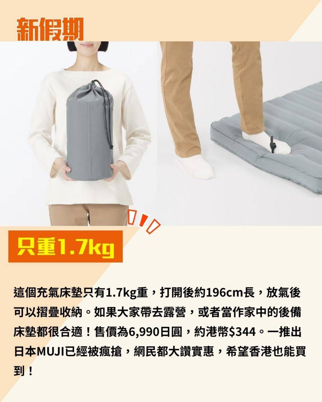 這個充氣床墊只有1.7kg重,打開後約196cm長,放氣後可以摺疊收納。如果大家帶去露營,或者當作家中的後備床墊都很合適!售價為6,990日圓,約港幣$344。一推出日本MUJI已經被瘋搶,網民都大讚實惠,希望香港也能買到!