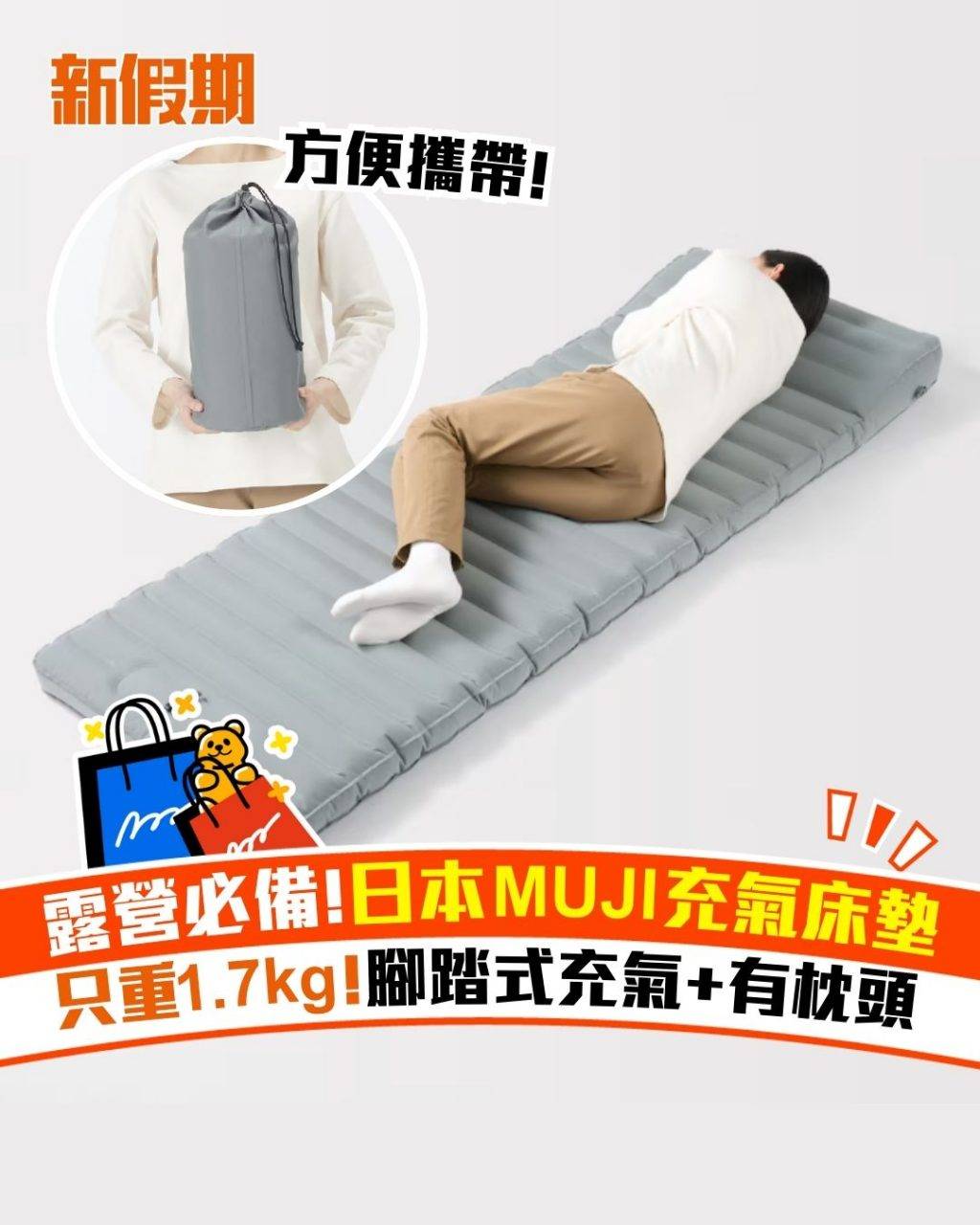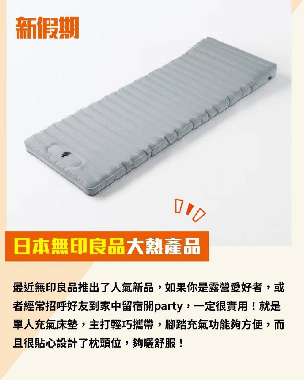 最近無印良品推出了人氣新品,如果你是露營愛好者,或者經常招呼好友到家中留宿開party,一定很實用!就是單人充氣床墊,主打輕巧攜帶,腳踏充氣功能夠方便,而且很貼心設計了枕頭位,夠曬舒服!