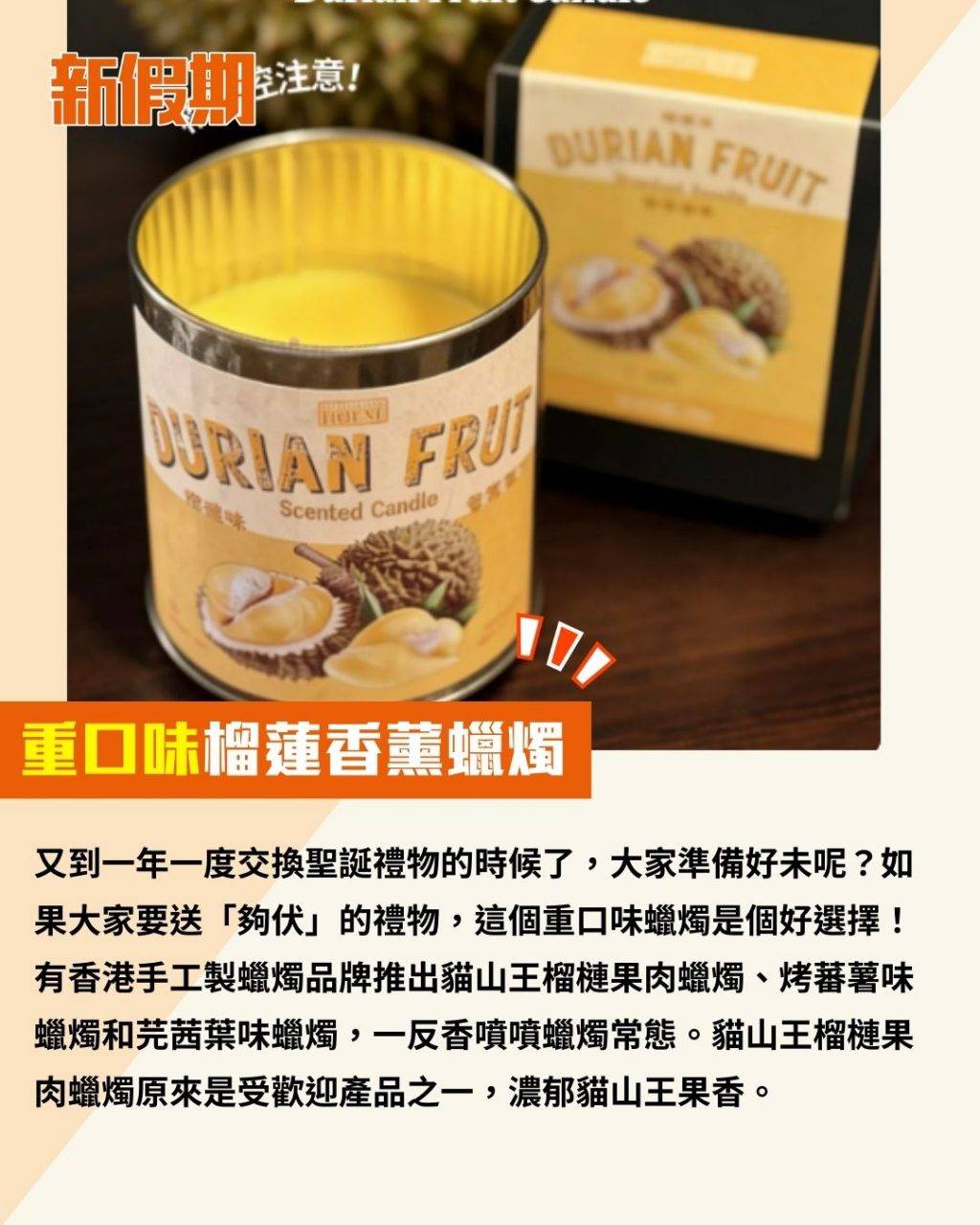 又到一年一度交換聖誕禮物的時候了,大家準備好未呢?如果大家要送「夠伏」的禮物,這個重口味蠟燭是個好選擇!有香港手工製蠟燭品牌推出貓山王榴槤果肉蠟燭、烤蕃薯味蠟燭和芫茜葉味蠟燭,一反香噴噴蠟燭常態。貓山王榴槤果肉蠟燭原來是受歡迎產品之一,濃郁貓山王果香。