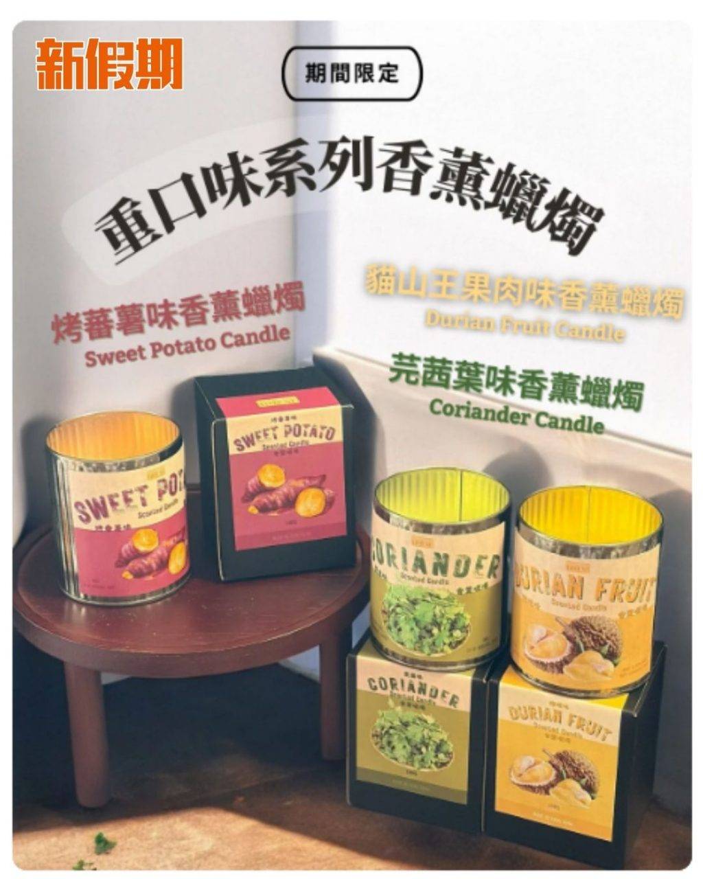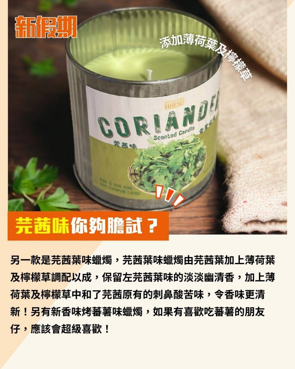 另一款是芫茜葉味蠟燭,芫茜葉味蠟燭由芫茜葉加上薄荷葉及檸檬草調配以成,保留左芫茜葉味的淡淡幽清香,加上薄荷葉及檸檬草中和了芫茜原有的刺鼻酸苦味,令香味更清新!另有新香味烤蕃薯味蠟燭,如果有喜歡吃蕃薯的朋友仔,應該會超級喜歡!