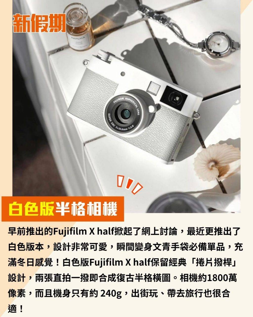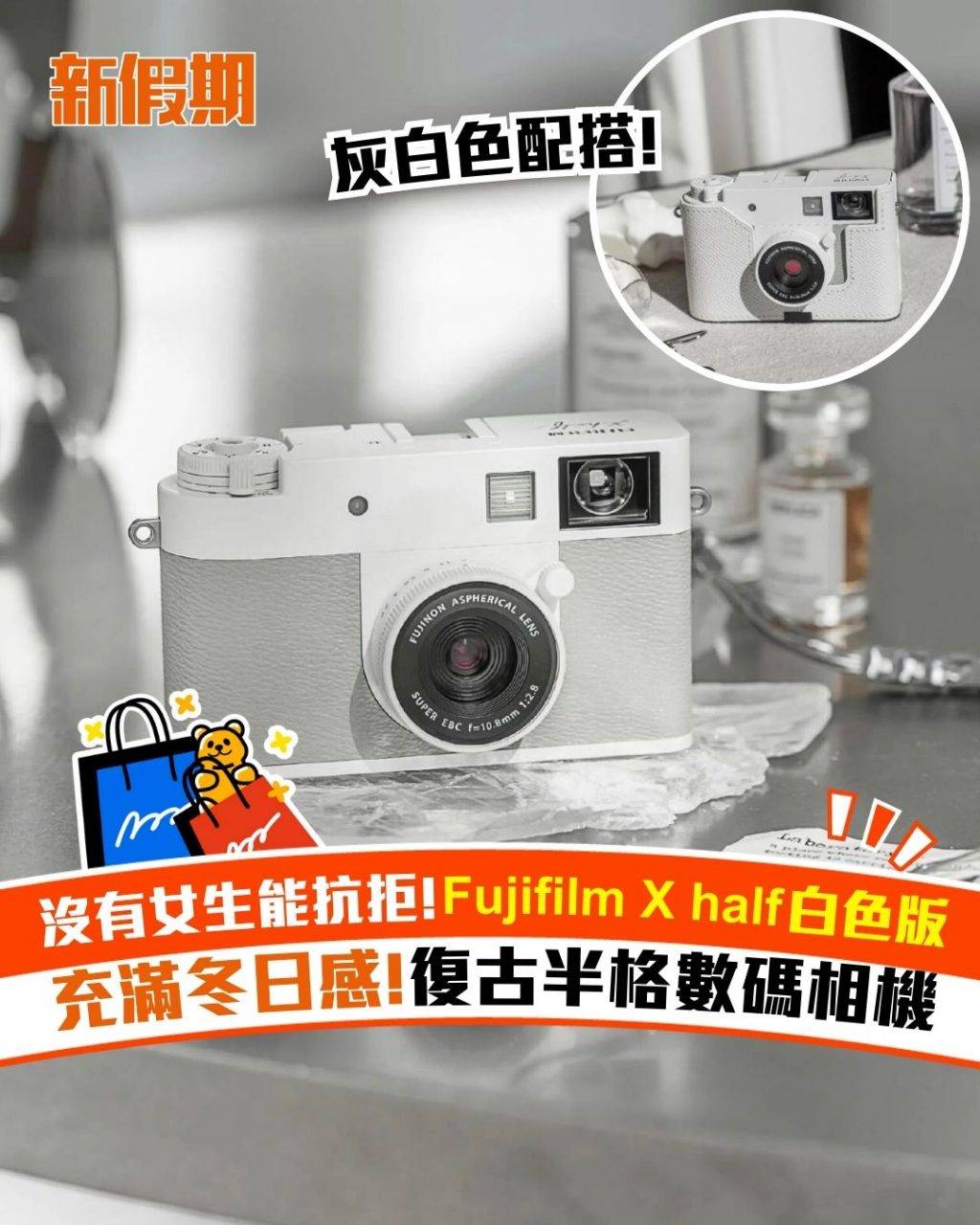 早前推出的Fujifilm X half掀起了網上討論,最近更推出了白色版本,設計非常可愛,瞬間變身文青手袋必備單品,充滿冬日感覺!白色版Fujifilm X half保留經典「捲片撥桿」設計,兩張直拍一撥即合成復古半格橫圖。相機約1800萬像素,而且機身只有約 240g,出街玩、帶去旅行也很合適!