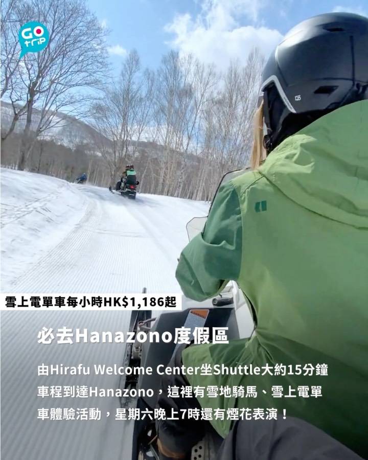 由Hirafu Welcome Center坐Shuttle大約15分鐘車程到達Hanazono,這裡有雪地騎馬、雪上電單車體驗活動,冬季每逢星期六晚上7時還有煙花表演! 雪上電單車有分單人和雙人,每小時HK$1,186起。