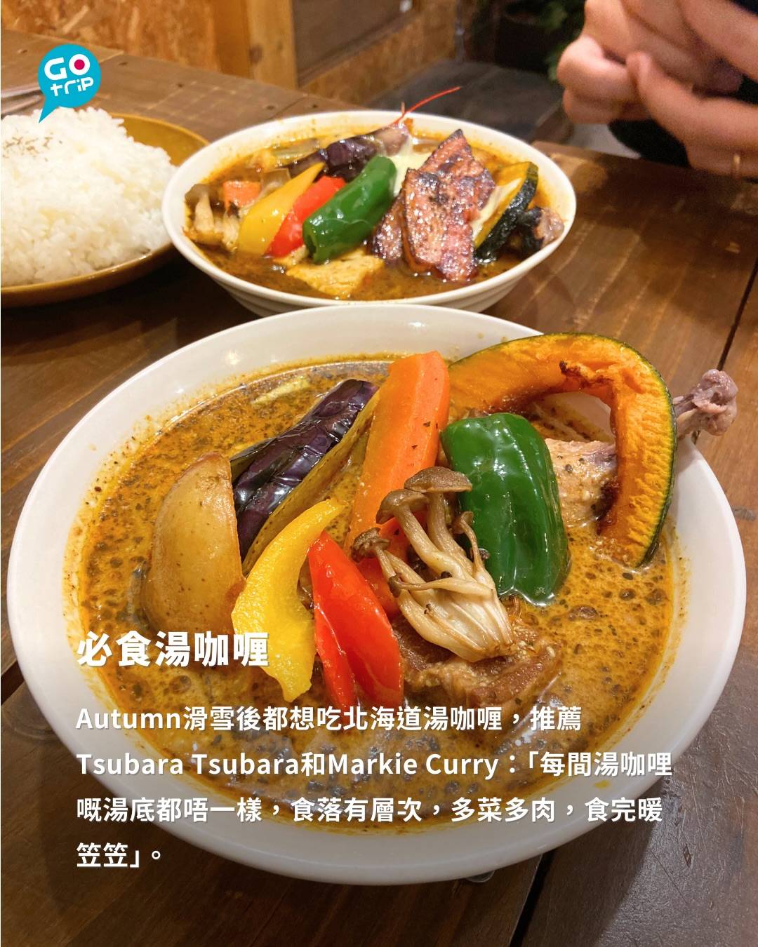 Autumn滑雪後都想吃北海道湯咖喱,推薦Tsubara Tsubara和Markie Curry:「每間湯咖哩嘅湯底都唔一樣,食落有層次,多菜多肉,食完暖笠笠」。
