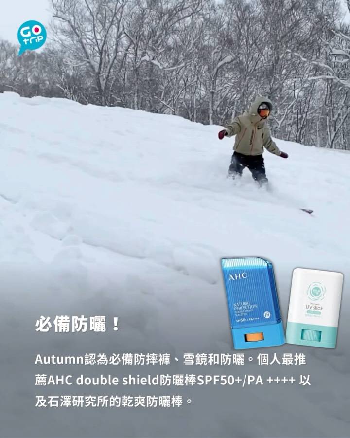 Autumn認為必備防摔褲、雪鏡和防曬。個人最推薦AHC double shield防曬棒SPF50+/PA ++++ 以及石澤研究所的乾爽防曬棒。