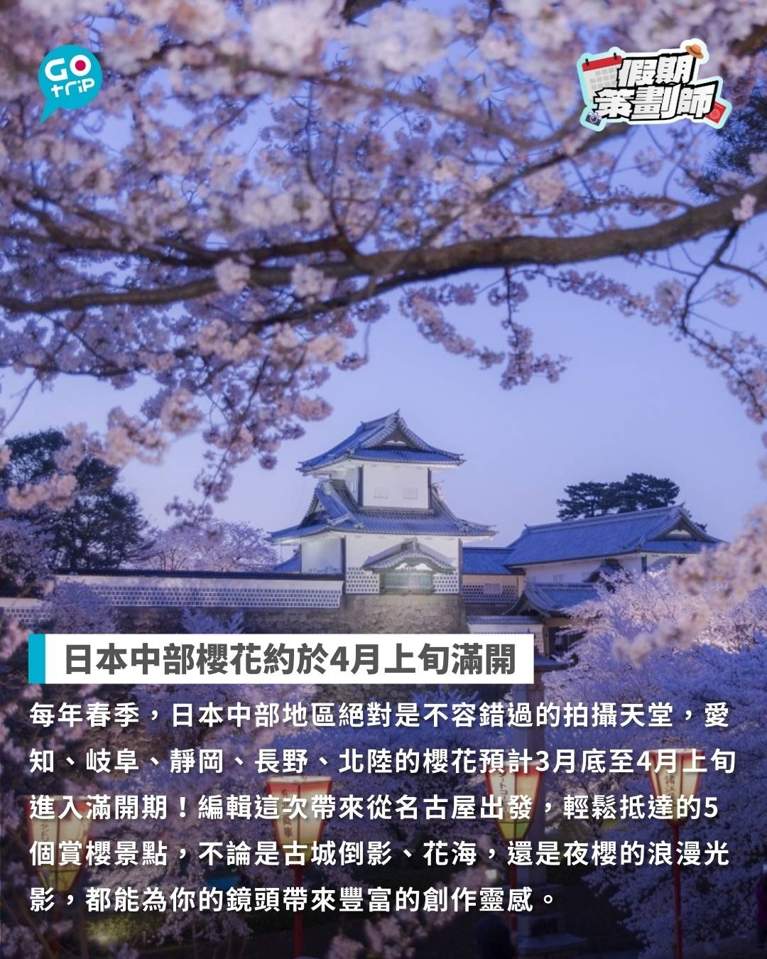 每年春季,日本中部地區絕對是不容錯過的拍攝天堂,愛知、岐阜、靜岡、長野、北陸的櫻花預計3月底至4月上旬 進入滿開期!編輯這次帶來從名古屋出發,輕鬆抵達的5個賞櫻景點,不論是古城倒影、花海,還是夜櫻的浪漫光影,都能為你的鏡頭帶來豐富的創作靈感。