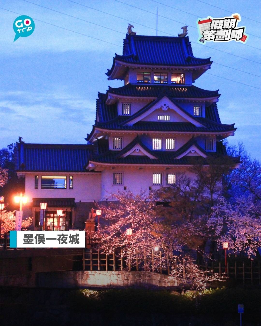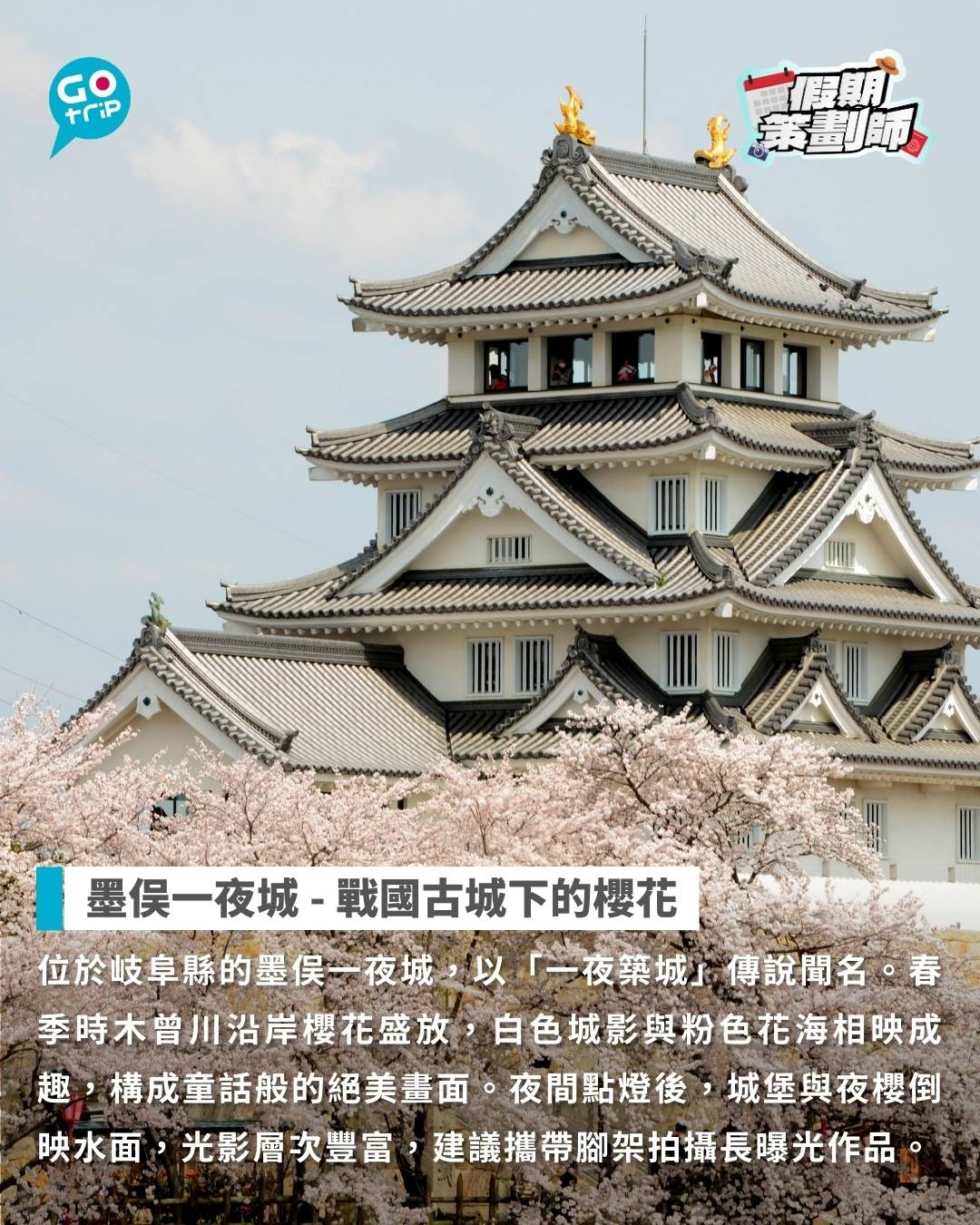 位於岐阜縣的墨俣一夜城,以「一夜築城」傳說聞名。春季時木曾川沿岸櫻花盛放,白色城影與粉色花海相映成趣,構成童話般的絕美畫面。夜間點燈後,城堡與夜櫻倒映水面,光影層次豐富,建議攜帶腳架拍攝長曝光作品。
