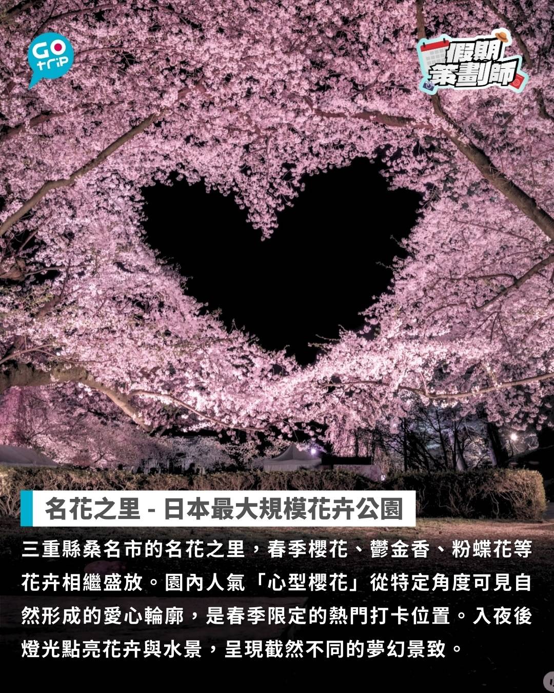 三重縣桑名市的名花之里,春季櫻花、鬱金香、粉蝶花等花卉相繼盛放。園內人氣「心型櫻花」從特定角度可見自然形成的愛心輪廓,是春季限定的熱門打卡位置。入夜後燈光點亮花卉與水景,呈現截然不同的夢幻景致。