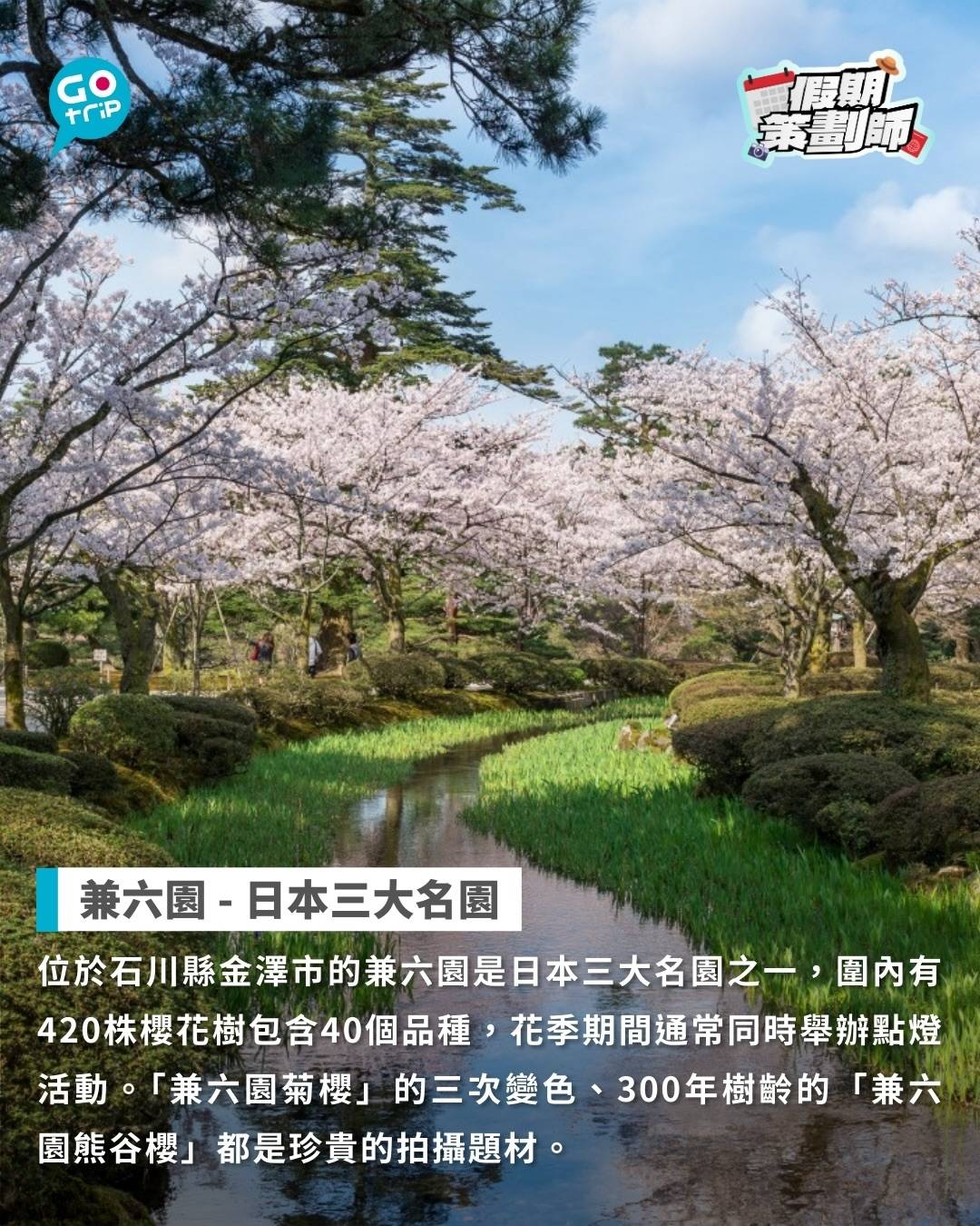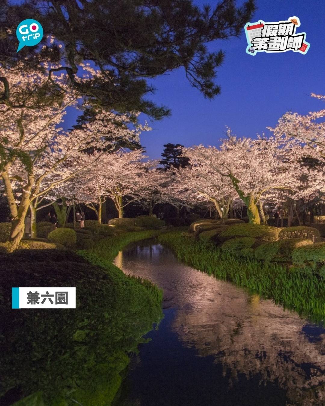 位於石川縣金澤市的兼六園是日本三大名園之一,圍內有420株櫻花樹包含40個品種,花季期間通常同時舉辦點燈活動。「兼六園菊櫻」的三次變色、300年樹齡的「兼六園熊谷櫻」都是珍貴的拍攝題材。