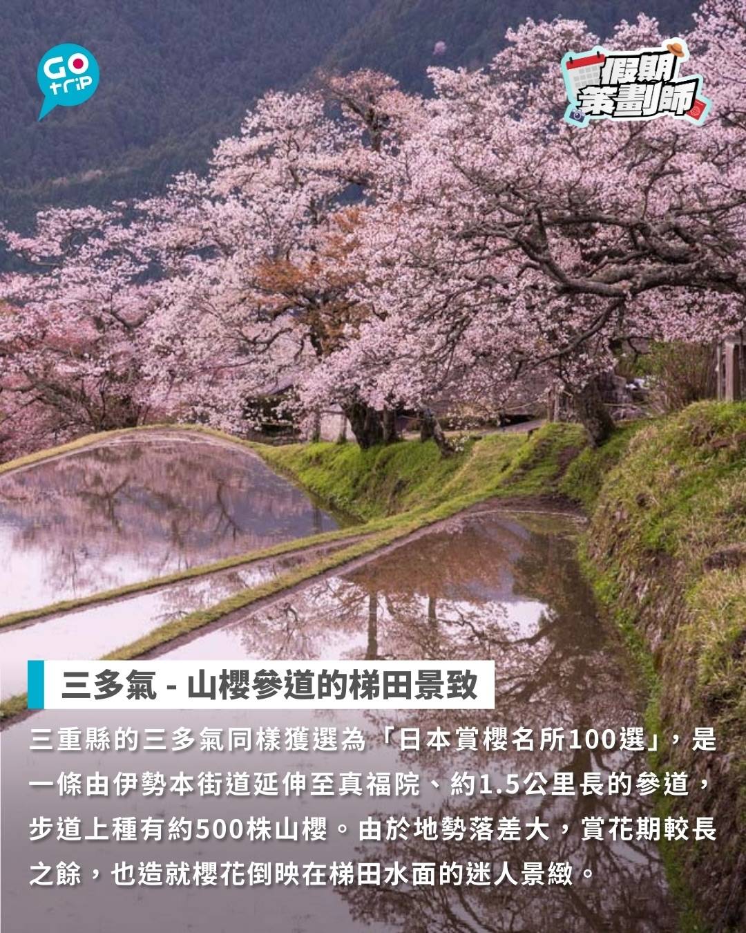 三重縣的三多氣同樣獲選為「日本賞櫻名所100選」,是一條由伊勢本街道延伸至真福院、約1.5公里長的參道,步道上種有約500株山櫻。由於地勢落差大,賞花期較長之餘,也造就櫻花倒映在梯田水面的迷人景緻。