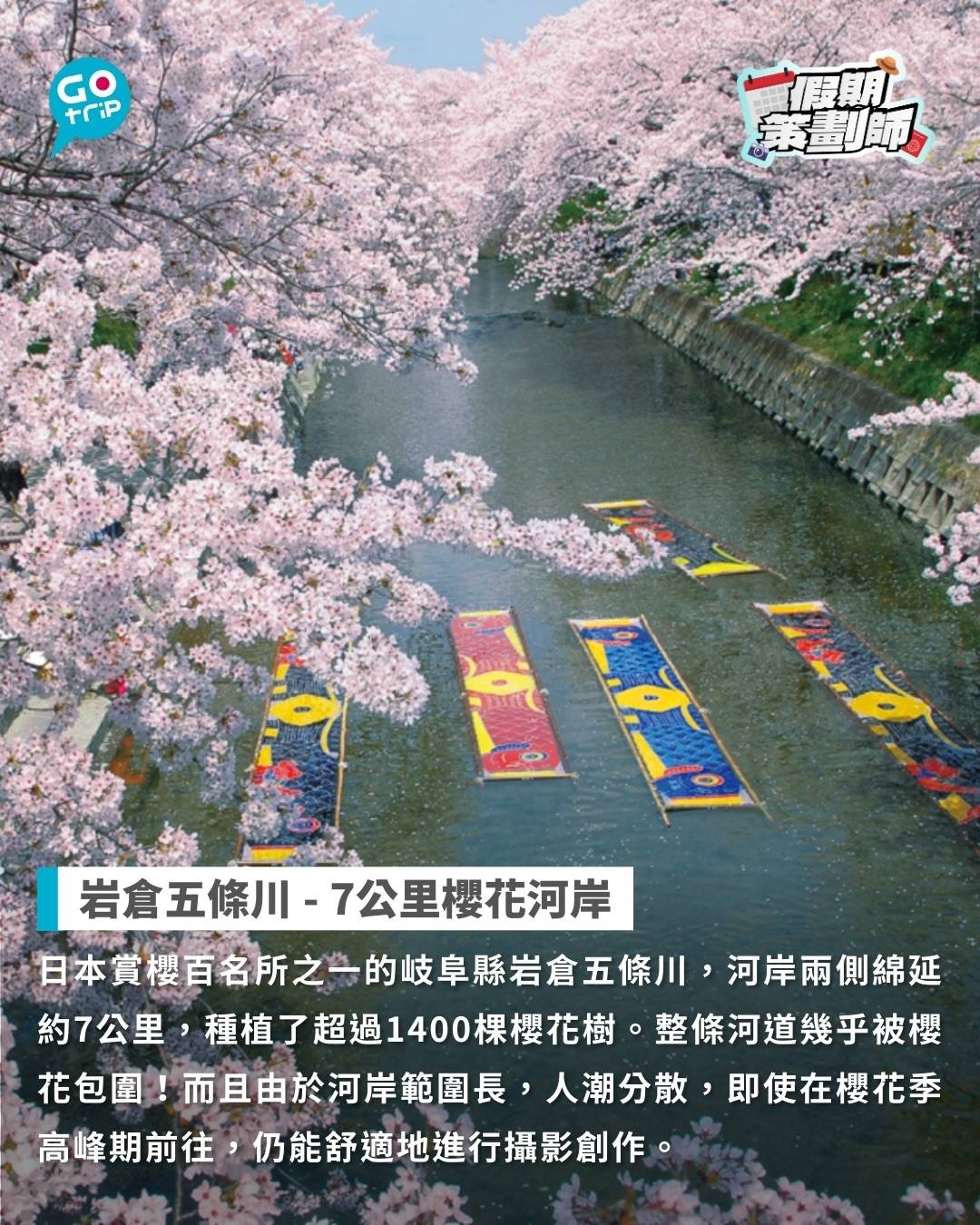 日本賞櫻百名所之一的岐阜縣岩倉五條川,河岸兩側綿延約7公里,種植了超過1400棵櫻花樹。整條河道幾乎被櫻花包圍!而且由於河岸範圍長,人潮分散,即使在櫻花季高峰期前往,仍能舒適地進行攝影創作。